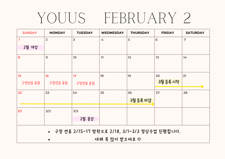유어스 가족 여러분, 벌써 2월이에요! 이번 달은 날짜가 짧은 만큼, 하루하루 더 알차고 신나게 보내봐요. 중간에 있는 설 연휴에는 맛있는 음식 마음껏 드시며 행복 충전하시고요! 연휴 끝나고 오시면 그 에너지만큼 제가 발레로 활활 태워드릴게요. 2월에도 지치지 말고, 유어스 발레와 함께 건강한 땀방울 흘리며 즐겁게 달려봅시다! 복 많이 받으세요! <img src="https://blogthumb.pstatic.net/MjAyNjAxMjlfNDEg/MDAxNzY5NjY3NzYxOTU5.1BC4dTSpUpXxYajIg3VjPf0eNz7dzabfOvUG6lm0-4cg.I_uxwL12XIHf9G0M6qfOryVaFkSi-Im2sjwPA9Ko-LYg.PNG/Beige_Minimalist_Customizable_Printable_Calendar_%2833%29.png?type=s3" />