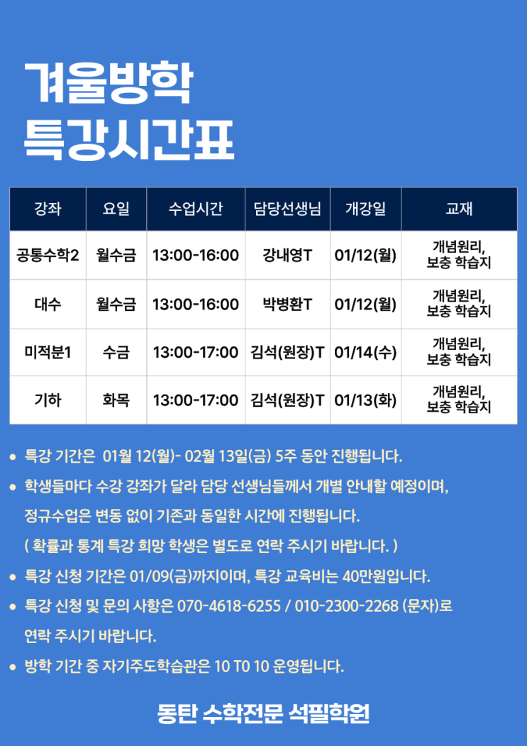 [동탄수학 석필학원] 겨울방학 특강 안내