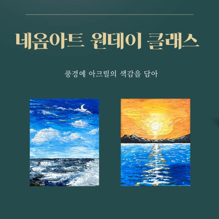 네옴아트에서 1월11일 일요일에 원데이 클래스 수업이 진행 되었습니다 아크릴 물감을 이용한 수업으로 풍경을 그렸습니다~ 멋진 노을 풍경을 그리는 수강생 처음이지만 쉽게 그릴 수 있게 알려드린다구요~! 알아서도 척척 금손 수강생 그라데이션을 멋지게 넣으시는 금손님 >< 완성작품 ! 앞으로도 진행될 네옴아트 원데이클래스 많은관심 부탁해요 <img src="https://blogthumb.pstatic.net/MjAyNjAxMTJfMTA0/MDAxNzY4MjAzNTU5NDE2.UpShQOOj0zX3BYSYNtkO-tYln-nyaY059px0mhrPBUwg.g4xEMYrDADeFlOfceNCjKQRqyLZ2oEmM609m4LzhIHUg.JPEG/%C1%A6%B8%F1%C0%BB_%C0%D4%B7%C2%C7%D8%C1%D6%BC%BC%BF%E4._%281%29.jpg?type=s3" />