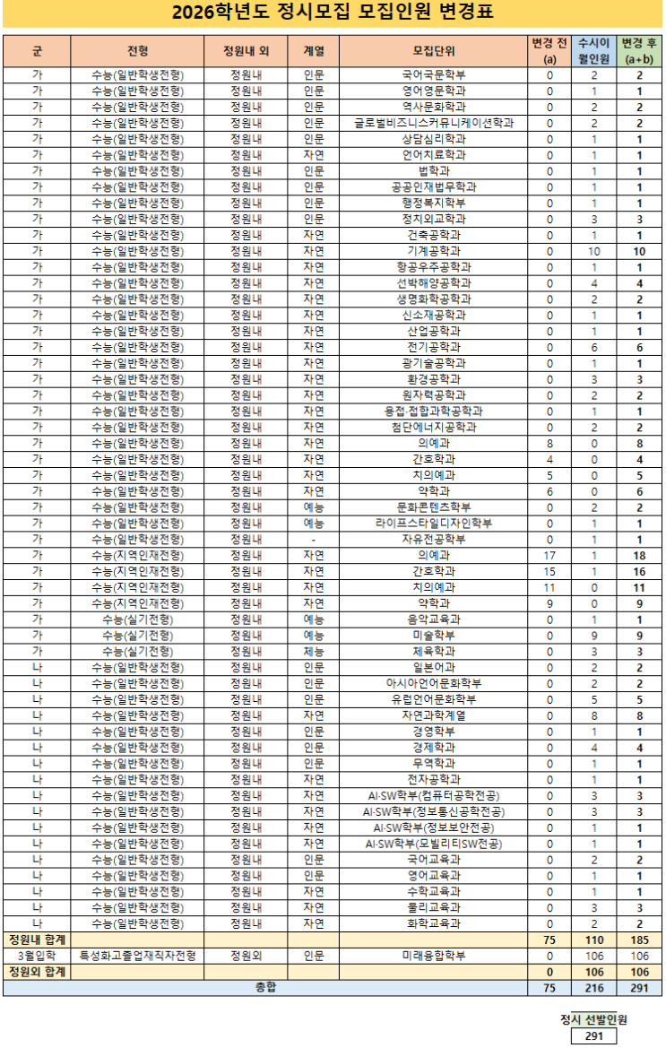 2026 조선대학교 정시 모집 확정인원(수시이월 포함)