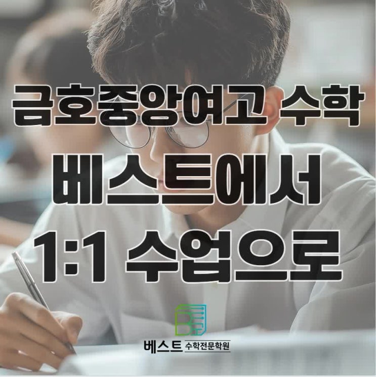 안녕하세요, 언제나 정성을 담아 지도하는 베스트수학전문학원 입니다. 오늘은 금호중앙여고 수학 1:1 수업으로 저희 학원에서 어떻게 이루어지고 있는지 자세하게 말씀드려 볼게요! 학생별 맞춤 수업이 필요한 이유 내신이든 수능이든 중요한 것은 자신의 취약점을 얼마나 정확히 파악하고 그것을 어떻게 보완하는지입니다. 저희 베스트의 수업은 단순히 문제풀이를 반복하는 수업이 아니라 학생 개개인의 실력을 바탕으로 진행하고 있어요. - 취약 단원 분석 - 오개념 진단 - 학습 전략 설계까지! 부족한 개념은 1:! 설명 수업으로, 실전 감각은 맞춤형 첨삭과 문제 풀이로 금호중앙여고 학생들이 필요한 부분만 깊이 있게 학습할 수 있도록 설....... <img src="https://phinf.pstatic.net/image.nmv/blog_2026_03_06_990/mVoxgXYWWS_01.jpg?type=f480x480" />