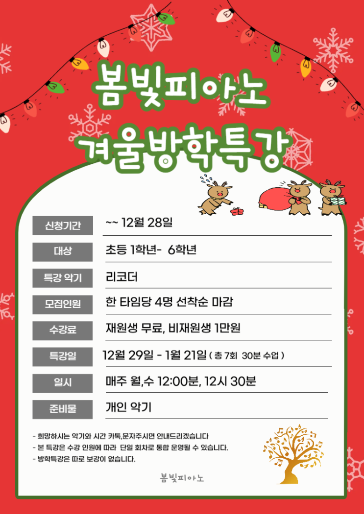 안녕하세요 봄빛피아노입니다 이제 곧 우리 아이들의 방학이 시작되는데요 봄빛도 그에 맞춰서 특강이 시작됩니다 학교 수행평가를 대비한 리코더 특강으로 평소 음악시간에 서툴었던 친구들이라면 여유로운 방학기간을 이용해서 수행평가 마스터 비재원생도 가능하니 문자/ 전화로 문의주시면 안내드리겠습니다 ☎️ 010-4964-5360 <매 수업 2회 레슨 진행> - 집중 레슨 + 연습•피드백까지 한 번에 <피아노 전공 원장 직강> - 음악 감상 특강, 이론 수업 포함 <소수정원제 운영> - 한 명 한 명 꼼꼼히,맞춤 수업 <정기 피드백 + 콩쿨/연주회 참여> - 실력 + 자신감 + 무대 경험까지! <img src="https://blogthumb.pstatic.net/MjAyNTEyMjJfNDQg/MDAxNzY2Mzg3NjMyMjM4.-gbdRXhuoqjn6Cc3BeC6c3Lv1Tuu7qPCJ0GZfdIkyScg.ngV8QK0kv4cpWLkMdDNL0g_bCMS7IBZKeaMD6hYxo1Ig.PNG/IMG%A3%DF8528.PNG?type=s3" />