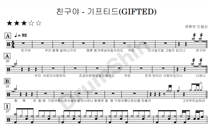안녕하세요^^ 광주 최고의 시설 & 실용음악 전문학원 "블루실용음악학원" 입니다. "5"만 유튜버 "드럼신"원장님이 언제나 최고의 드럼실력으로 여러분과 함께 합니다 오늘 올려드릴 영상과 악보는 ' 기프티드 ' 의 "친구야" 입니다 체계적인 노하우로 드럼 연주에 도움이 될 수있게 직접 정성껏 만들었습니다 드럼반주자 분들께 많은 도움이 되시기를 바랍니당^^ 즐겁게 감상해주셔요^^ 악보 구매 사이트 드럼 & 악기 & 보컬 레슨문의 네이버 톡톡 : 블루실용음악학원 카카오톡 : 블루실용음악학원 인스타그램 : @bluemusic_academy 디엠은 언제나 환영해요^^ 감사합니당^^ <img src="https://blogthumb.pstatic.net/MjAyNTEyMjNfMjA1/MDAxNzY2NDcwNDI5MjM2.SS4a28_AnlXoU3vaGQ4tRZD4kP3jchylZ6SushF_zEgg.Cmm0aB9HJzCicRGBOHeni3CBxpGy0hKyRttAZfKdOdEg.PNG/%C4%A3%B1%B8%BE%DF_%BA%ED%B7%CE%B1%D7.png?type=s3" />