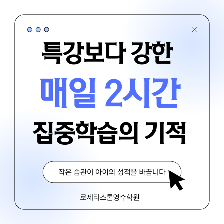 특강보다 강력한 방학 매일 2시간 집중학습의 기적 방학이 되면 학부모님들께서 가장 많이 하시는 고민이 있습니다. “이번 방학엔 어떤 특강을 들어야 할까요?” 하지만 저는 현장에서 아이들을 지도하며, 이 질문보다 훨씬 중요한 사실을 수없이 확인해 왔습니다. 아침부터 밤까지 특강으로 채운 아이보다, 매일 2시간, 스스로 몰입하는 아이가 훨씬 성장합니다. 화려한 강의가 실력을 만들어 줄 것 같지만, 진짜 실력은 조용한 몰입의 시간에서 만들어집니다. 방학, ‘특강’의 함정에서 벗어나야 합니다 특강을 많이 들으면 아이도, 부모님도 안심이 됩니다. “공부는 했으니까요.” 하지만 강의를 듣는 공부는 대부분 입력(Input) 에서 끝납....... <img src="https://blogthumb.pstatic.net/MjAyNjAxMDJfMjcz/MDAxNzY3MzU0OTk3NzE0.Jprly4_pQYE5H1SlfiEZQdTwIPSGgmich4JebjvxUaUg.XgrQMgB_NPxvHkyVRCC8h6-wTcdMaKeLN1yElNHGubkg.PNG/1.png?type=s3" />