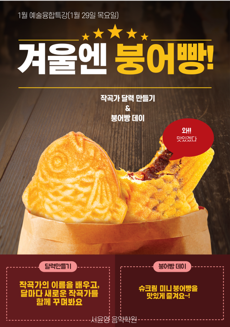 안녕하세요 실력이 자라는 음악교육 서윤영 음악학원 입니다:) 1월 마지막주에는 2026년을 맞이하여, 우리 아이들이 다함께 “작곡가 달력만들기”수업을 하였어요~~!! 특강수업만 하면 재미없죠?? 겨울엔 뭐니뭐니해도 붕어빵이 아니겠어요 ㅎㅎ 그래서 겨울 간식으로 “붕어빵”도 준비해 보았습니다. 원장님이 팥을 안먹는(?)관계로다가 울 아이들도 슈크림 붕어빵으로 작곡가 달력은 매달 다른 작곡가의 이름을 배우고 열심히 색칠하며 꾸며주었어요 우리 아이들 얼마나 이쁘게 잘 색칠하는지 붕어빵도 냠냠 먹으면서 꾸며보아요 그리고 두둥☁️ 1월 모범 어린이상을 뽑아서 요즘 핫한 ”두쫀쿠“증정까지‼️ 1월 한....... <img src="https://blogthumb.pstatic.net/MjAyNjAyMDJfMTEz/MDAxNzcwMDIwNDYyMzA1.VHhfvr-fydF_eRXQGskgemNJsUiDo8e2FRlSVpL18rAg.0ZjGTVzyj16JZy3eoW-S-TVx6xWk9wUrq6t12koitQAg.PNG/IMG%A3%DF2798.PNG?type=s3" />