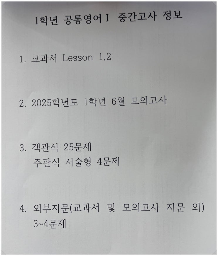 서일여고 1학년 2026년 1학기 중간고사 영어 시험범위 오케 100점 간다!!! <서일여고 1학년 1학기 중간고사 영어 시험범위> 1학년 공통영어 I 중간고사 정보 -------------------------------------------- 교과서 Lesson 1, 2 2025학년도 1학년 6월 모의고사 (객관식 25문제) 외부지문(교과서 및 모의고사 지문 외) 3~4문제 주관식 서술형 4문제 <img src="https://blogthumb.pstatic.net/MjAyNjA0MDFfNzgg/MDAxNzc1MDQ5NTEyMjY1.AnYc3a7qEUH2QCe5sr-5FgHQRR9FE-Q2j1S3WvAI5dMg.ZkBmt_rOKbIWnT7bnDPyfh3Dp9HUdXLL91A9jf5y1e0g.JPEG/temp_1775049310127.2003666151.jpeg?type=s3" />