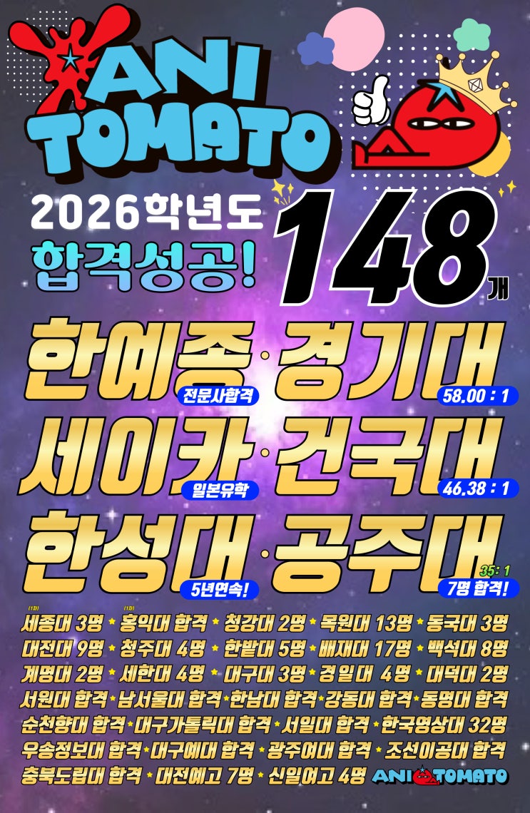 결과로 증명하는 애니토마토입니다. 올해 애니토마토는 총 148개의 합격증이라는 자랑스런 결과를 만들어냈습니다. 입시의 흐름은 매년 변하지만, 애니토마토가 지향하는 본질은 변하지 않습니다. 학생 한 명 한 명의 가능성을 깊이 들여다보고, 수년간 쌓아온 데이터와 체계적인 커리큘럼을 통해 ’합격할 수밖에 없는 실력‘을 만드는 데 집중해 왔습니다. 한예종 전문사 합격부터 경기대(58:1), 건국대(46.38:1)와 같은 높은 경쟁률을 뚫어낸 성과, 그리고 5년 연속 한성대 합격이라는 기록은 애니토마토가 가진 꾸준함의 힘을 보여줍니다. 올해도 저희를 믿고 따라와 준 학생들과 묵묵히 뒷바라지해 주신 학부모님들께 깊은 감사를 전합니다....... <img src="https://blogthumb.pstatic.net/MjAyNjAzMjdfMjg1/MDAxNzc0NjAxMzI5MjUx.1gZ3KMFm-S9MN3SpUvagdpFMx62VuM68pBp_Mo8p1Mwg.1JhlYZZNKGHVfR9CujnpumKEVjOzMokiuw0s0ULCEb8g.JPEG/KakaoTalk_20260317_191147607.jpg?type=s3" />