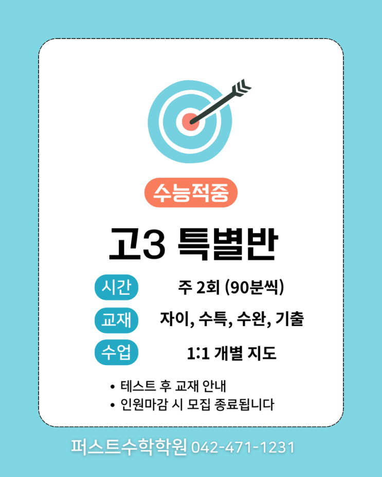 안녕하세요? 퍼스트수학학원입니다. ⭐️고3을 위한 특별반⭐️ 1. 수업 방식 1 : 1 개별 지도 ➡️ 기초부터 킬러 문항까지 “내가 필요한 부분만” 2. 교재 자이스토리 수능 특강 (ebs 연계 교재) 수능 완성 (ebs 연계 교재) 기출 (모의고사, 모의평가, 수능) 필요 시 타 교재로 변경 / 추가 가능 ☎️ 테스트 & 방문 상담 100% 예약제 042-471-1231 010-7455-1321 (문자) 부재 시 문자 남겨주시면 수업이 끝나는대로 전화 드리겠습니다. #둔산동고등수학 #둔산동소수정예 #둔산여고수학학원 #둔원고수학학원 #충남고수학학원 #한밭고수학학원 #괴정고수학학원 #만년고수학학원 <img src="https://blogthumb.pstatic.net/MjAyNjAzMjBfMTM2/MDAxNzczOTMzMTMxMjIz.7tAKz_ofS9jsjl_4idMZGDoGyA0M_1HL3N72tKu16uEg.odK4d7KFs_l6hwGyvRQC3dPahg3nfY_IJhYEFquW11gg.PNG/%C3%BB%B7%CF%BB%F6_%C1%D6%C8%B2%BB%F6_%B8%F0%B4%F8_%C7%D0%BF%F8_%B8%F0%C1%FD_%B1%A4%B0%ED_%C0%CE%BD%BA%C5%B8%B1%D7%B7%A5_%B0%D4%BD%C3%B9%B0.png?type=s3" />