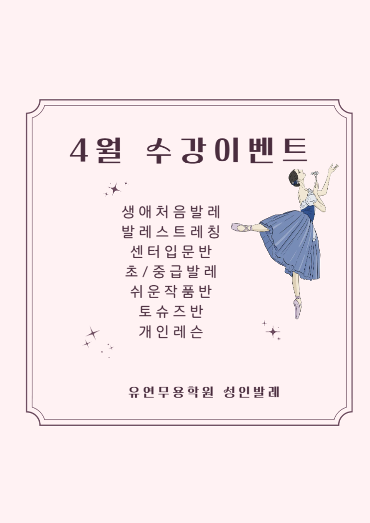 안녕하세요~ 곳곳에 꽃들이 피어나고 따뜻한 날이 마음까지 설레이게 합니다^^ 그동안 발레 어렵게 느껴지셨죠? 생애처음발레에서는 발레가 처음이어도 쉽게 재미있게 배울 수 있어요!! 수업은 수시등록제라서 원하는 날짜에 시작할 수 있습니다. (곧 마감되는 반들 많아서 서둘러 주세요~) 발레를 배우면 가장 먼저 찾아오는 변화가 상체 어깨라인 입니다. 승모근이 펴지고 어깨가 내려가 목이 길어짐을 1달만 꾸준히 해도 느낄 수 있어요!!(거북목교정) 그 다음은 틀어진 골반이 교정되고, 혈액순환이 잘되어 다리 붓기가 줄어 하체라인이 정돈됨을 느낄 수 있습니다. 수업내내 쉬지 않고 움직이는 속근육과 잔근육 사용으로 엄청난 체력소모로....... <img src="https://blogthumb.pstatic.net/MjAyNjAzMjNfMTUx/MDAxNzc0MjM2MjQ1NjAx.bPYZiIf0jPegyyXUJHWMZRplvtN88CmwJ1BOW5lkYjcg.XYiyuM_QheNBv9Z6BeaVtGCNhphArY8_j3WF1DEMkW8g.PNG/%C1%A6%B8%F1%C0%BB_%C0%D4%B7%C2%C7%D8%C1%D6%BC%BC%BF%E4_-001_%283%29.png?type=s3" />