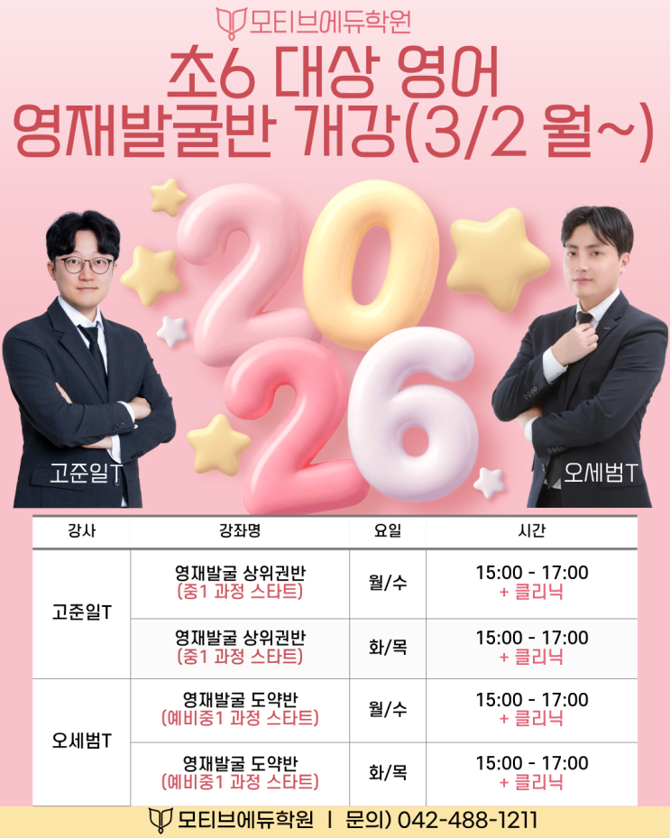 [제 서 5296호] 둔산동 국어 / 영어 / 수학 / 과학 / 사회 상위권이 선택한 내신&수능 전문 모티브에듀학원 안녕하세요 모티브에듀학원입니다! 초등학교 6학년, 이제는 늦지 않게 입시영어의 체계적인 학습을 진행할 때입니다! 실려과 관리,두 마리 토끼를 모두 한 번에 잡는 수업, 초6 영재발굴반으로 오세요! 새 학년, 제대로 시작하면 결과가 달라집니다. 검증된 탄방중 / 문정중 전임 영어강사가 수업하고 직접 관리합니다. 매 학기, 매 시험마다 늘 결과로, 성과로 증명해 내고 있습니다. 체계적인 입시영어의 시작, 그리고 문정/탄방/삼천중학교와 연계됩니다. **영어 영재발굴 도약반 [예비중1 과정 스타트]** - 담당강사 : 문정중 전....... <img src="https://blogthumb.pstatic.net/MjAyNjAyMDhfOTIg/MDAxNzcwNTIwNDA2OTg3.by1M9oHfuFBEH4UNaXQCYVNjnL9LLD7wnLifepkXKCMg.VRGNILM4oKAohTcKX3xVBt_iNahOC7iFllGNa7_khNgg.PNG/%BB%E7%BA%BB_-_1.png?type=s3" />