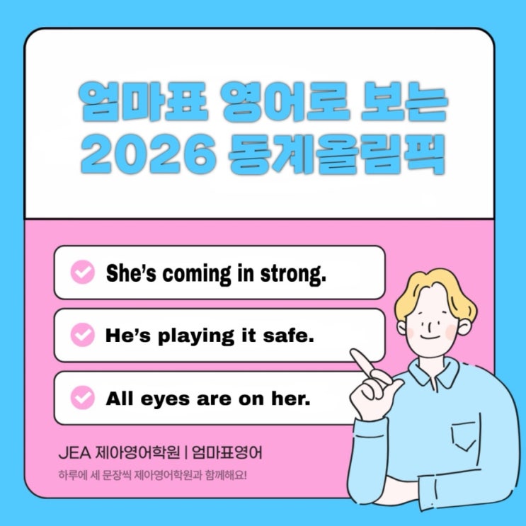 안녕하세요! 대전 관저동 1:1 프리미엄 맞춤 영어학원 JEA 제아영어학원입니다. 올림픽은 아이에게 영어책보다 더 강력한 교재가 되기도 해요. 규칙을 몰라도, 단어를 다 알지 못해도 상황과 감정이 먼저 보이는 영어가 있기 때문이에요. 2026 동계올림픽 중계를 보며 아이와 함께 귀에 담아두고 싶은 문장들이 있어요. 오늘은 교과서에서는 잘 만나기 어렵지만, 실제 원어민 중계에서는 정말 자주 들리는 영어 문장 세 가지를 엄마표 영어 시선으로 나눠보려 해요. 뻔하지 않지만 자주 쓰는 영어 3문장 이번 주 7일 동안 3번 사용해 보기 도전해 보시는 건 어떨까요? 일주일에 3문장씩 한 달에 4주가 있다면 무려 12문장을 한 달에 배울 수 있답....... <img src="https://blogthumb.pstatic.net/MjAyNjAyMDlfMTkg/MDAxNzcwNjA0MjIzNjEx.TBTY6zEg5n5aV5nBysYDdY6I0pYCS8B6cU28Rq25Hhog.nyx4AZyo4EzVzjruirE0Uc3WdiLj9F9oWcX7RwYrl9Mg.JPEG/B878F7C6%A3%AD3E74%A3%AD495D%A3%AD9E74%A3%AD806DDBBF204A.jpeg?type=s3" />