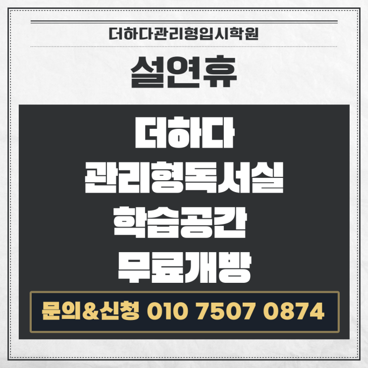 안녕하세요~ 대전둔산동, 더하다관리형입시학원 대표원장 안쌤입니다~ 곧, 기나긴 설 연휴가 다가옵니다. 저는 이번 설 연휴에도 본가에 내려가 부모님을 뵙는 것을 뒤로 미루고, 중고등 학생들과 함께 이번 설 연휴에도 정상적으로 영어 수업을 하기로 했습니다. 그리하여, 다가오는 설 연휴(2월 13일 금요일 ~ 2월 18일 수요일) 동안 저희 더하다관리형입시학원의 관리형독서실을 중·고등학생 아이들에게 무료로 개방하려 합니다. 설 연휴 기간 동안에도 아이들이 학습 리듬을 잃지 않고, 차분하게 공부할 수 있도록 준비하겠습니다. 혹시 집에서는 집중이 잘 안 되거나, 규칙적인 학습 분위기가 필요하다면 이번 기회에 꼭 활용해 보시길....... <img src="https://blogthumb.pstatic.net/MjAyNjAyMDlfMjQ2/MDAxNzcwNjQzNjAwNTI5.9FQ7Z8DnmmZJysBB6Fj1mMC54VPCxfBw4lPB1_qiyUQg.0goL3BFNzC4Z-DtePEEwdewTeYBMq6uLwPXw4Nxk89Eg.PNG/%BC%F6%C7%D0%B0%FC%B7%C3%BA%ED%B7%CE%B1%D7%C7%A5%C1%F6%C1%F6-002_%2815%29.png?type=s3" />