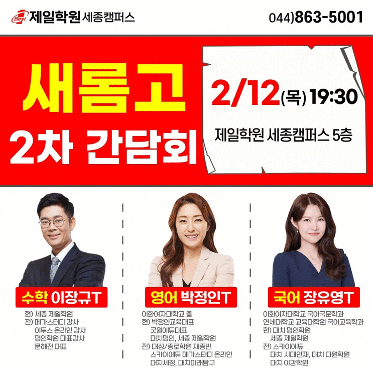 안녕하세요. 40년 입시명문, 제일학원 세종캠퍼스입니다. 지난번 새롬고등학교 1차 설명에서 보내주신 세종시 어머님들의 뜨거운 성원과 참여에 힘입어, 더 강력해진 구성과 강사진 라인업을 바탕으로 2월 12일 목요일 2차 간담회를 준비했습니다. 새롬고등학교 2차 간담회 2/12(목) 장소 : 제일학원 세종캠퍼스 5층 이번 설명회에서는 제일학원 세종캠퍼스 수학 이장규 선생님, 영어 박정인 선생님, 대치동 국어 장유영 선생님이 합류합니다. 새롬고등학교 내신을 정밀 분석한 결과를 바탕으로 내신대비 전략 포인트를 상세히 안내해드릴 예정입니다. 대치동식 분석과 새롬고 맞춤 전략을 바탕으로 내신을 제대로 준비해드리겠습니다. 새롬고 내....... <img src="https://blogthumb.pstatic.net/MjAyNjAyMTFfMTIy/MDAxNzcwNzg5MTUzNjgz.LwvQ5b5F8cf4y_hPSJjOECnoIYGc_cIDm9uISUWO_F8g.nl8d79wR2XvpGN5sDno_RXqZ9iHzAL9qGi650wQPZWYg.GIF/%A4%B7%A4%A9.gif?type=s3" />
