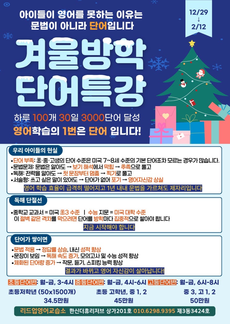 영단어 방학특강 하루 100개씩 30일 3000단어 달성 “아이들이 영어를 못하는 이유는 문법이 아니라 단어입니다” 우리 아이들의 현실: 실제 현 초.중·고생들의 단어 수준은 미국 7.8세 수준의 기본 단어조차 모르는 경우가 많습니다 그래서! 문법문제 문법은 알아도 → 보기 해석에서 막힘 → 추측으로 풀고 독해 전략은 배워도 → 첫 문장부터 멈춤 → 찍기로 풀고 서술형 → 쓰고 싶은 말이 있어도 단어가 없어 포기 → 영어자신감 상실 영어 학습 효율이 급격히 떨어지고 1년 내내 문법을 가르쳐도 제자리입니다 하지만 단어가 쌓이면 문법이 적용되고 → 문법문제 정답률 상승 → 내신성적 향상 문장이 보이고 → 독해 속도가 빨라집니다 →....... <img src="https://blogthumb.pstatic.net/MjAyNTEyMjNfMjQ0/MDAxNzY2NDYzMTg4MjE1.J4YkQcp8scqLDJYZ_Qirr8QrONr7F9uCdxso2EHawaog.GRiyNsFLT2qq6XP1WvbH6VEmchUp1SN2gk1u0IYcekgg.JPEG/%B0%DC%BF%EF%B9%E6%C7%D0%B4%DC%BE%EE%C6%AF%B0%AD.jpg?type=s3" />
