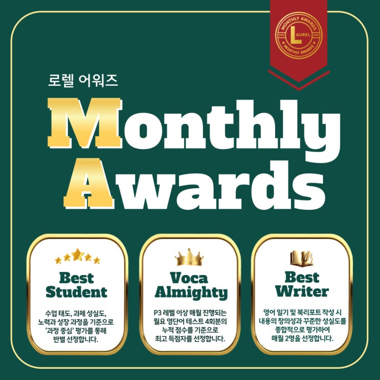 LAUREL AWARDS 로렐 어학원은 학생들의 성장 과정과 노력을 소중히 여깁니다. 단순한 점수 경쟁이 아닌, 한 달 동안의 태도·성실함·참여도·학습 성장을 종합적으로 평가, 매월 영역별 '로렐 어워즈' 선정을 통해 학생들에게 긍정적인 동기부여의 기회를 제공합니다. ⭐ BEST STUDENT OF THE MONTH 수업 참여도 및 적극성, 과제 수행의 성실도, 그리고 지난 기간 대비 학생의 노력과 성장 과정을 중심으로 각 반별로 선정됩니다. VOCA ALMIGHTY 월요 영단어 테스트 점수(월 4회 합산)를 기준으로 최고 점수 학생을 반별로 선정합니다. (Primary 3 레벨 이상 해당) ✍ BEST WRITER 영어 일기 및 북리포트의 내용의 참신성, 표....... <img src="https://blogthumb.pstatic.net/MjAyNjAzMDRfMTY3/MDAxNzcyNjE5MjkyNjAz.x6OwOIDcJWEUJF7NDSbXRwZe8QRuOQhwuj3eKXTOmoIg.EwbEDTiMV7EbT2XLNh8Z5gWjtTjpmHJaYdsmfXH5VA8g.JPEG/%B7%CE%B7%BC%BE%EE%BF%F6%C1%EE-001_%281%29.jpg?type=s3" />