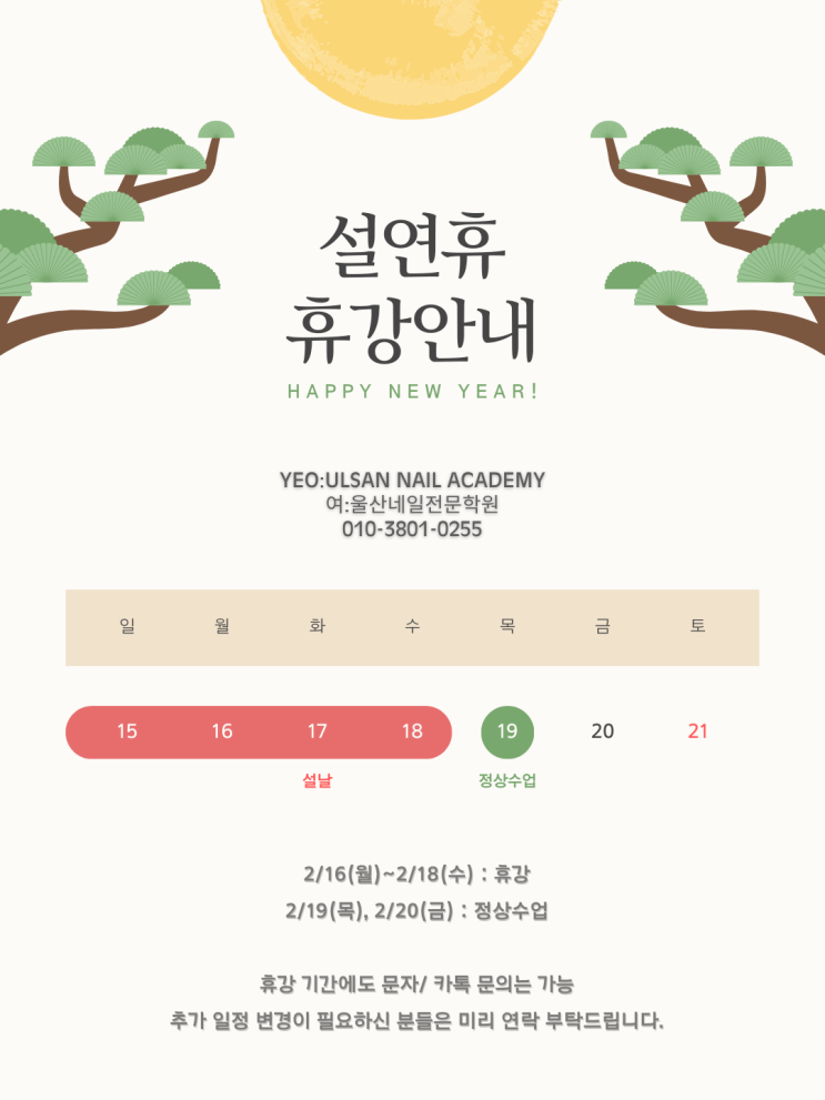 안녕하세요^_^ #울산네일전문학원 #여_울산네일전문학원 보미쌤이에용~! 다음주면 설 연휴 시작이죠~ 설 연휴 기간 학원 운영 일정 안내드립니다~! 수강생분들과, 상담문의는 일정 조율에 참고 부탁드려요ㅎㅎ ▶ 2/16~18(월~수) : 휴강 해당 기간에는 학원 수업 및 방문 상담이 어렵습니다. 문의 남겨주시면 확인 후 순차적으로 답변드리겠습니다 :) ▶ 2/19, 20(목, 금) : 정상수업 기존 수업은 정상저을 진행되며, 추가 수업일정 변동이 있으신 분들은 미리 연락 부탁드립니다^^ ※ 휴강기간에도 문자/카톡으로 문의는 남겨주실 수 있어요. 확인되는대로 빠르게 안내드리겠습니다 설 연휴 따뜻하고 행복하게 보내세요♥ 감사합니다 여:울산네....... <img src="https://blogthumb.pstatic.net/MjAyNjAyMTFfMTky/MDAxNzcwNzc0NDk3MzIz.rTLTeQYSMiP8j_JmPLAAmuUu06Bvpl_zTFoewjfZfRwg.b7mpMQiS9aa0dOXAaWnAp7kO1ZNi4Sspa5SljaHvjDQg.PNG/%B3%EB%B6%F5%BB%F6%B0%FA_%C3%CA%B7%CF%BB%F6_%C0%FC%C5%EB%C0%FB%C0%CE_%BB%F5%C7%D8_%C8%DE%B9%AB_%B0%F8%C1%F6_%C0%CE%BD%BA%C5%B8%B1%D7%B7%A5_%B0%D4%BD%C3%B9%B0.png?type=s3" />