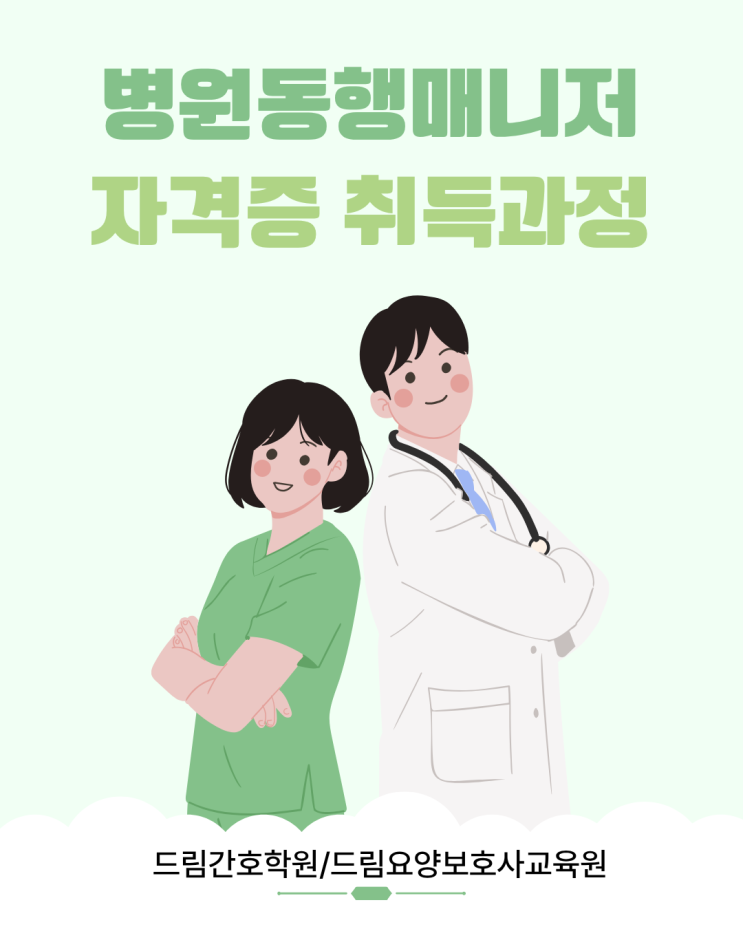 “누군가의 병원 가는 길을 함께하는, 새로운 전문 직업” 병원 진료가 필요한 어르신, 장애인, 거동이 불편한 분들에겐 ‘병원에 가는 것’ 자체가 큰 부담이 됩니다. 이때 필요한 사람이 바로 병원동행매니저입니다. 병원동행매니저는 ✔ 병원 이동 동행 ✔ 접수·수납 보조 ✔ 진료 전·후 안내 ✔ 보호자 역할 보완 을 수행하는 현장 중심 돌봄 전문 인력입니다. 병원동행매니저, 이런 분께 추천해요 요양보호사, 간호조무사, 사회복지사 등 돌봄·의료 관련 종사자 중장년 재취업을 고민 중인 분 경력 단절 후 사람 돕는 일로 시작하고 싶은 분 남·여 누구나 가능한 실무 중심 직업을 찾는 분 단기간 교육으로 자격증....... <img src="https://blogthumb.pstatic.net/MjAyNjAyMTFfNzgg/MDAxNzcwNzcwNjIxOTg1.DL8LLWAzKh_Micz1Wd-iSLnj1bgW7n8yZkILQlyQiCUg.aRLQT-SQaBnn4pPAOoiAvJ8TM2RRTy2DZCfNQsYmWX4g.PNG/%C1%A6%B8%F1%C0%BB_%C0%D4%B7%C2%C7%D8%C1%D6%BC%BC%BF%E4..png?type=s3" />