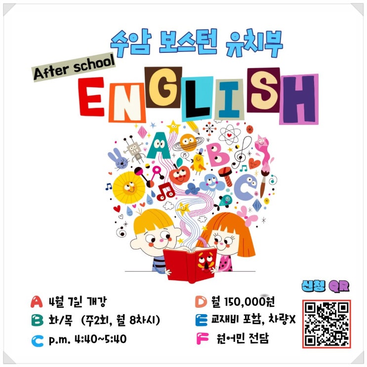 #방과후유치부영어 #수암보스턴어학원유치부 오랜만에 다시 개강하게 되는 유치부 소식입니다! 너~~~~~무 오래 기다리셨죠??? 준비가 좀 걸렸네요 ㅎ 수업내용 설명부터 드릴게요~ 먼저 파닉스 혹은 읽고 쓰기를 위한 수업이 아님을 강조, 또 강조 드려요!!! 유치부 발달 특성을 고려해서 읽고 쓰기부터 가르치는 것은 "영어를 싫어하게 만드는 지름길!" 입니다 원어민 선생님과 함께 주제관련 학습을 하는데 주제가 직업탐험에 맞춰 진행됩니다 연관해서 스토리북 추가될 예정이에요~ 즐겁게 영어로 말하고! 듣고 표현하고! 활동하면서 하는 노출!!! 눈에 도드라지는 읽기능력과는 다르지만 이게 진짜 제대로 시작하는 출발점이라는 사....... <img src="https://blogthumb.pstatic.net/MjAyNjAzMjdfMjc3/MDAxNzc0NTY5OTkzNDE3.xmqkW-0IDCqYqYfwtf7_qgPxYNHUsqqzdpbPtNEA4vYg.VKy-IMNGFICVSV4ha3l_EHzuYhdhHxCRAwBtbyBRgOYg.JPEG/%C1%A6%B8%F1%C0%BB_%C0%D4%B7%C2%C7%D8%C1%D6%BC%BC%BF%E4._%2858%29.jpg?type=s3" />