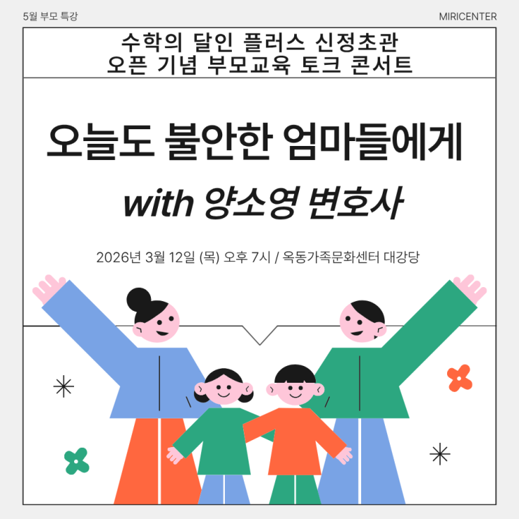 학부모 상담을 하다 보면 많이 듣게 되는 말이 있습니다. “원장님... 제가 지금 잘하고 있는 걸까요?” 아이 교육에서 가장 힘든 건 공부가 아니라 부모의 마음인지도 모릅니다. 그래서 이번에 수학의 달인 플러스에서는 조금 특별한 자리를 준비했습니다. 세 아이를 서울대로 보낸 엄마, 양소영 변호사와 함께하는 학부모 토크 콘서트입니다. 안녕하세요! 울산 남구 수학학원 수학의 달인 플러스 대표 원장 박연미입니다. 우리 아이들, 세상 그 누구보다 잘 키우고 싶은데... 왜 이렇게 불안할까요? 저 역시 엄마로서 아이를 키우다 보면 문득 이런 생각이 들 때가 있습니다. 내가 제대로 하고 있는걸까? 이 선택이 맞는 걸까? 아이를 사랑할수....... <img src="https://blogthumb.pstatic.net/MjAyNjAzMDlfMjY4/MDAxNzczMDY3MTIzOTc1.jfZ4TEVX7ljAr0DNbEYmd9kVnokPjrjJVLTNQ2Ki7DEg.A9X2efdIalER_sFOtR8jc_PeR909el1ubtqKAUDxrUgg.PNG/%C1%A6%B8%F1%C0%BB_%C0%D4%B7%C2%C7%D8%C1%D6%BC%BC%BF%E4..png?type=s3" />