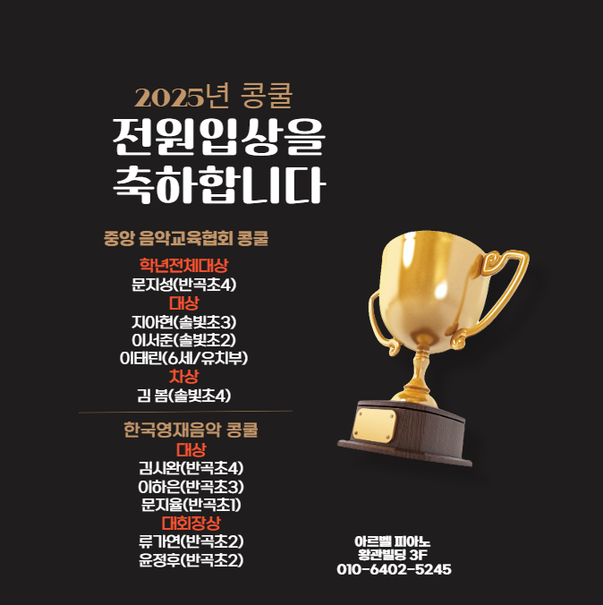 안녕하세요. 아르벨피아노 입니다. 25년 콩쿨수상 내역입니다. 우리 친구들 배운지 1년정도만에 모두 고득점 수상 하였습니다:) 저희 원 다수 학부모님들이 얼마 안되었는데 악보도 잘보고, 연주를 이렇게 할 수 있어서 놀랍다며 말씀해주세요-! 그만큼 퀄리티 높은 피아노 수업 자부합니다:) 저희 원은 기초부터 계이름만 맞게 치는 단순한 수업이 아닌 손목 릴렉스와 무게 테크닉 등 좀 더 섬세한 수업이 들어갑니다. ✔️1:1 피아노 전공 원장직강 소수정원제 수업 콩쿨 영상과 더불어 아이들 수업영상은 ✔️인스타그램 @arbell_piano 들어가시면 더 많이 볼수있습니다. 상담은 예약제로 진행되며 (이름/나이/진도과정/원하는타임) 같이 말씀....... <img src="https://blogthumb.pstatic.net/MjAyNjAxMDlfOTcg/MDAxNzY3OTIwNTgwNzgw.FfIECluLrMFy8gDgpFZ6YM23aODNjfWcerSL0HHR6Twg.lCqGn7Zfwu3D8WeAy_uRAD0KpfnGKcm5hMJOgcN8yGIg.PNG/IMG%A3%DF0388.PNG?type=s3" />