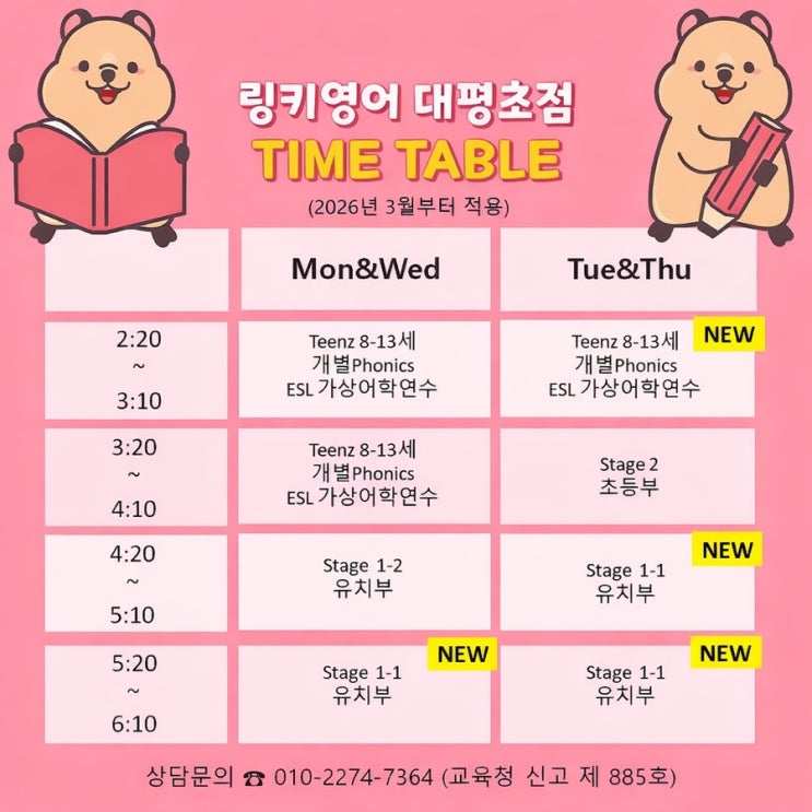 #시간표안내 안녕하세요~대평초점 원장 Anna입니다✋ 2026년도 시간표 안내 드립니다. ✡️ [NEW] 화&목 2:20 ✡️ [NEW] 월&수 5:20 ✡️ [NEW] 화&목 5:20 ✨대기확정 중✨ - 유치부 오픈예정 (2월중) 3월부터 조정되는 반과 새로 오픈하는 반 안내드립니다. 신학기 문의 및 등록이 많습니다. (소규모 정원제로 운영하오니, 1:1무료체험 수업과 상담 신청주세요) #세종영어 #세종초등영어 #세종유아영어 #대평동영어 #대평동영어학원 #대평동초등영어 #대평동유아영어 #링키영어세종 #링키영어대평초점 #세종해들빛어린이집 #대평유치원 #해들유치원 #세종대평어린이집 #대평초등학교 <img src="https://blogthumb.pstatic.net/MjAyNjAxMTBfMjIz/MDAxNzY4MDQwMDY0NjY3.M5gVsnZcolHd9XQLFb3pFwZw8AOuHBxzGYdYApy3o8Mg.Grfk9cKOH9oYR29INM8TLjFWDCNgUB7CS2cOBzRMDtQg.JPEG/IMG%A3%DF6513.jpg?type=s3" />