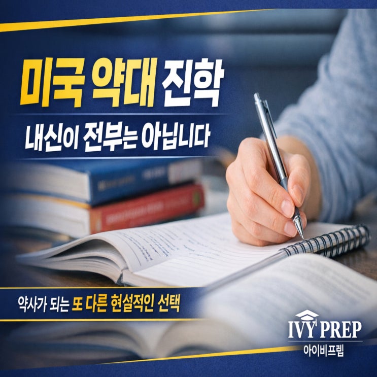 안녕하세요? 아이비프렙입니다. 한국에서 약대 진학은 의대·치대와 함께 최상위권 성적을 요구하는 대표적인 전공입니다. 내신 상위 1% 이내, 수능 최상위권이라는 조건 앞에서 많은 학생들이 일찌감치 가능성을 접어버리기도 합니다. 하지만 미국 대학으로 시선을 넓히면 이야기의 구조가 달라집니다. 내신 6~7등급의 학생이라도 약사가 되는 길을 현실적으로 설계할 수 있는 구조가 존재합니다. 오늘은 학부모님과 학생들이 가장 많이 궁금해하시는 질문을 중심으로 미국 약대 진학의 실제 구조와 전략을 정리해 드리겠습니다. 미국 약대 진학, 현실적으로 가능한 이유 1. 미국 약대는 한국과 구조 자체가 다릅니다 미국 약대는 한국처럼 입학....... <img src="https://blogthumb.pstatic.net/MjAyNTEyMTdfMzEg/MDAxNzY1OTY5ODM0OTY5.8v_TAZLz_NLG2WKIQD0jEsnpioz2tI4YuBKXj8xmy9kg.5KxCKZNAOzpitzvDgalX4hJ1iyYMVHKP5hGAtxYCBsUg.JPEG/%C1%A6%B8%F1%C0%BB_%C0%D4%B7%C2%C7%CF%BC%BC%BF%E4.jpg?type=s3" />