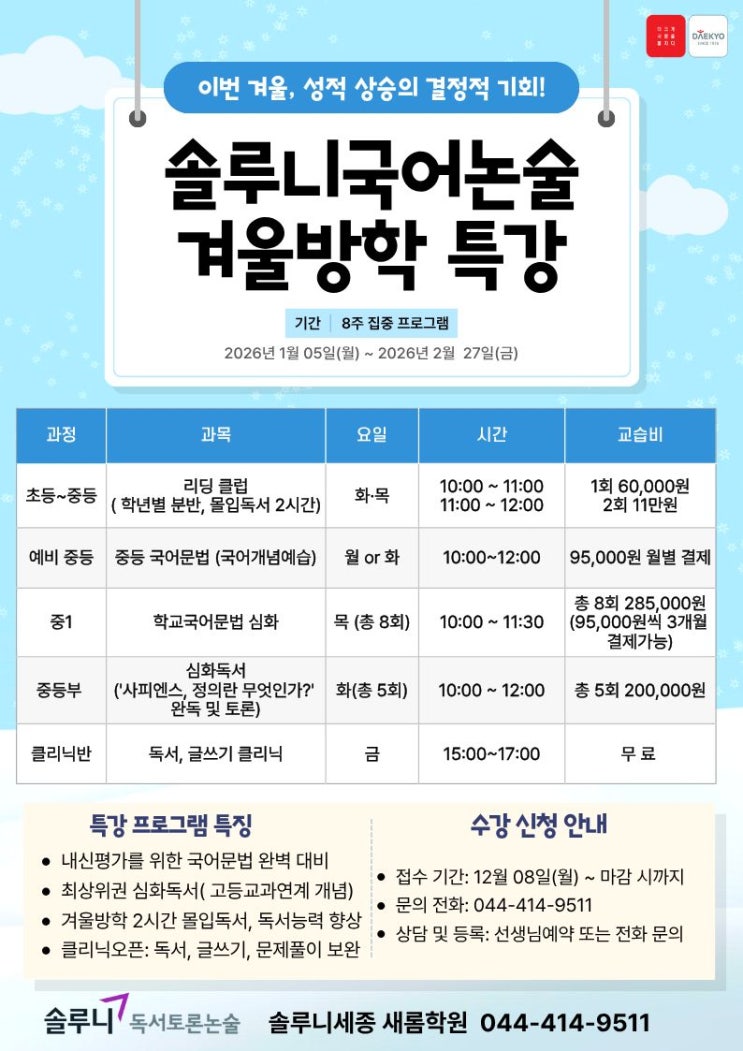 솔루니새롬학원 겨울방학특강이 오픈됩니다. 겨울방학이 시작되는 1월~2월까지 아이들에게 꼭 필요하고 솔루니가 가장 잘하는 프로그램들로 알차게 준비했어요. 우리 아이에게 무엇이 필요한지 프로그램 살펴보시고 서둘러서 신청하세요. 솔루니새롬학원 겨울방학 특강 안내 드립니다 *기간: 2026년 1월~2월 1. 리딩클럽: 초등~중학생/ 화, 목 10~11시, 11시~12시/ 주 1회(월 4회) 6만원, 2회(월 8회) 11만원/ 요일, 타임 선택 가능/ 방학 오전 시간 몰입 독서로 부족한 배경 지식 확장과 독서 습관 기르기 2. 예비중등(현 초6) 국어 문법(국어 개념 예습)/ 목 또는 금 13시~14시/ 95,000원 월별 결제, 중학교 국어 완벽 대비 3. 학교 국어 문법....... <img src="https://blogthumb.pstatic.net/MjAyNTEyMTlfMjgw/MDAxNzY2MTExMTQwNjc5.5fpTJBbFq4QYuGa_DkjKN0bD3e6n21cBekw1U-ftzZ8g.PPuC2kwx_OF_U2IcRez7a5c8v8kfgY60ANq8fDst2JIg.JPEG/%BB%F5%B7%D2%C0%FC%C3%BC_%BE%C8%B3%BB%B9%AE.jpg?type=s3" />