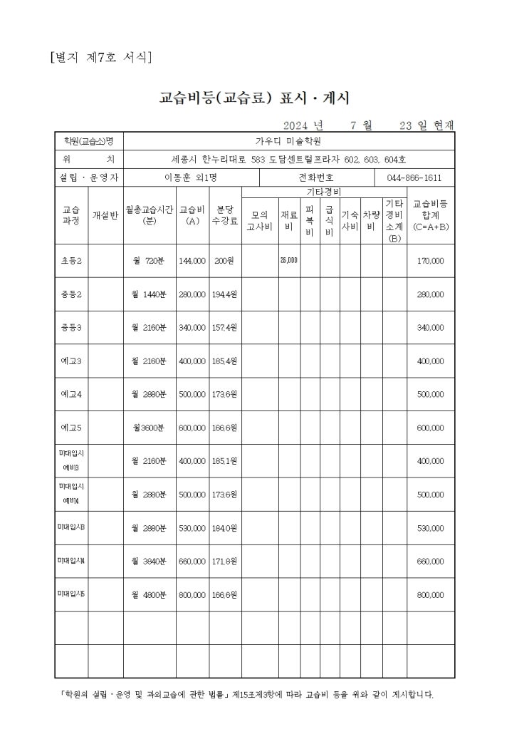 [세종시입시미술학원]가우디미술학원 수강료 표시 안내