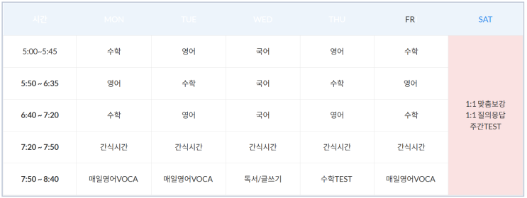 1. 예비중1/예비중2/예비중3 개강 1월 5일 월요일 드디어 2026년 새로운 시작입니다 특히나 이번 중등 프로그램은 상위권학원이 작정하고 더욱 발전된 시스템으로 공부합니다 기존의 시스템보다 훨씬 꼼꼼하고 학생들을 잘 연습/훈련시켜서 명문대 합격의 밑바탕을 만들수 있는프로그램 이제 상위권이 학생들을 상위권을 넘어 최상위권으로 만들어줄것입니다. 최고의 성과를 내기 위해서는 고등학교에서 잘하려면 중학교때부터 훈련이 필수 입니다. 학습시간은 주5일(월화수목금)+토요일 보강이며 1일 학습시간은 수업 3타임(45분강의)+ 간식시간(25분)+ 영어VOCA+수학테스트(50분)로 이루어집니다 예비중1 <예시시간표> 상세일정은 학원으....... <img src="https://blogthumb.pstatic.net/MjAyNTEyMTNfMTE4/MDAxNzY1NjA0NTM3OTY3.rzfXkDhvjoh_3c4e7__u5IQGHbBe9N9Tp1nmq0g-xfIg.h7ZDVSvFLsU-7QxwT6sr4zpJWZMXeQItKqt_OHTFM4gg.PNG/image.png?type=s3" />