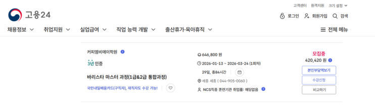 국비수업 https://www.work24.go.kr/ 오픈 되었습니다. 1급과 2급 통합 마스터 과정 개인부담금 323,400원 (개인의따라 약간의 차이는 있음) 커피엠비에이학원 등록번호 제1140호 문의 : 044-905-0060 #커피mba #세종mba #세종시 바리스타학원 #세종바리스타 #세종커피학원 #세종워크홀릭 #세종시국비 #학업숙려제 #세종시호주워홀바리스타 #교사연수 #위클레스 #교육청 위탁기관 <img src="https://blogthumb.pstatic.net/MjAyNTEyMTdfMTQy/MDAxNzY1OTE0ODEzMjkx.9xDgN9JqcmQcej2Dzp5eIhSAgsQoibcWIJ6lC8oeJKIg.vYui0yxL9G4BIVjMs0xVqPuKQrCL2kHtSAHCkpfs6Isg.PNG/IMG%A3%DF1903.PNG?type=s3" />