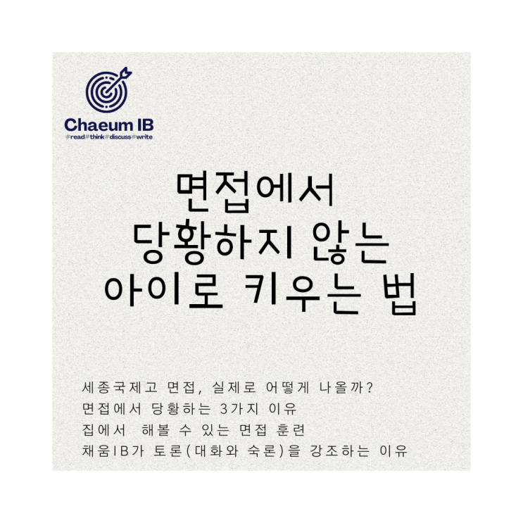 세종국제고 면접, 어떻게 준비시키고 계신가요? 세종국제고 면접, 어떻게 준비시키고 계신가요? 매년 12월, 세종국제고 면접을 앞두고 많은 학부모님들이 비슷한 고민을 하십니다. "책을 많이 읽히면 될까요?" "아이가 평소엔 말을 잘 하는데, 면접장에서 갑자기 굳어버리면 어떡하죠?" "열심히 준비했는데 막상 모르는 주제가 나오면요?" 오늘은 아이들이 면접에서 당황하는 진짜 원인과, 부모님이 직접 해줄 수 있는 것, 그리고 그 너머에서 필요한 것까지 솔직하게 써보려 합니다. 왜 아이들은 면접장에서 당황할까요? 2024년부터 세종국제고 면접은 구상시간 6분, 답변시간 6분으로 바뀌었습니다. 주어진 사회....... <img src="https://blogthumb.pstatic.net/MjAyNjAzMDZfMjg5/MDAxNzcyNzcxNTA5MzAy.Q0lTbCAdXvPK1bqAeDEF3BboG5_dwqBCzXrktv7GwqQg.XL3qochQeymOiVW4f1UKNVKUgOh-NI5qNFs7JBapGcAg.PNG/%BA%ED%B7%CE%B1%D7_%C7%CF%B4%DC_%B0%F8%C5%EB.png?type=s3" />