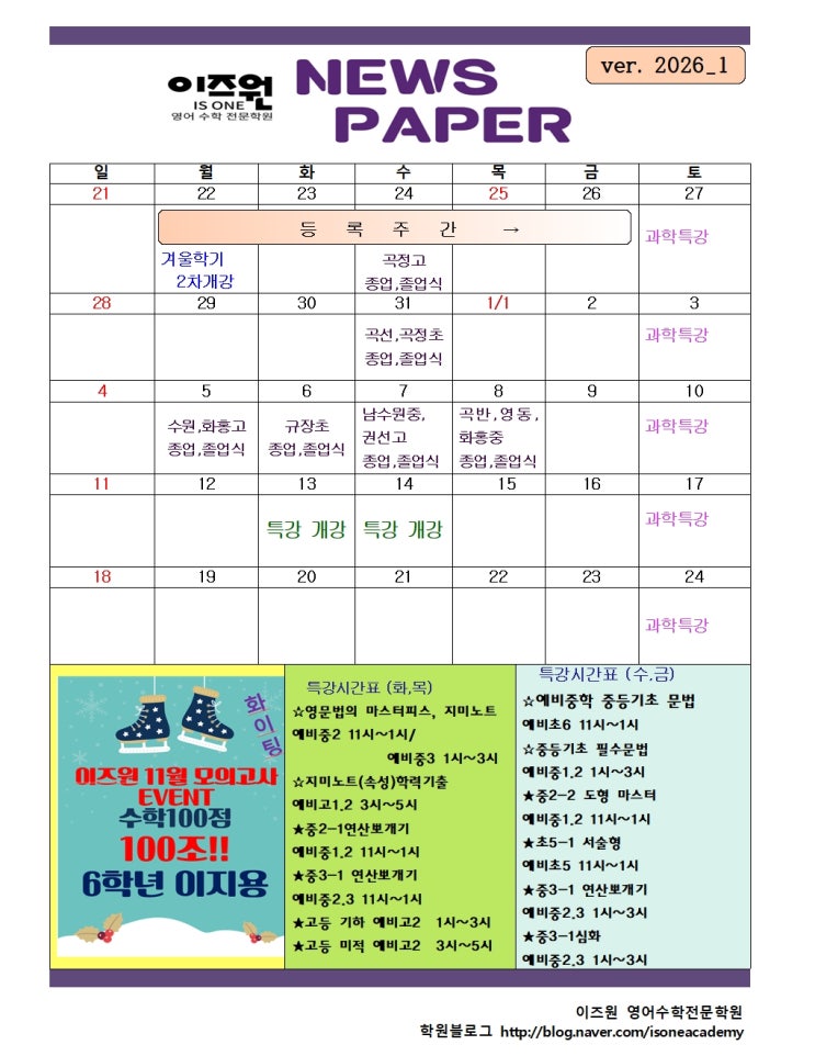 안녕하세요 1/8(목)-1/9(금) 학원 방학입니다. 학습상황을 점검하고 재충전 하는 시간이 되길 바랍니다. 새해 복 많이 받으세요♂️ ✔️1/6(화)부터 방학시간표 적용 ✔️1/7(수) 초등 특강 시작 선행제(선행초축제) 듀오의 무대 여름방학 학원 이벤트로 영어노래, 안무 연습을 열심히한 것이 계기가 되어 참여했다고 합니다 자신감과 실력모두 멋져요! 감사합니다♂️ <img src="https://blogthumb.pstatic.net/MjAyNjAxMDdfMjAz/MDAxNzY3NzgzNzAzMTUy.pnLiYU2jI7DG0QD_asdO5z_ze-m7MwYxECy41AAmtFIg.Bvvur7RhnWsNkkesc9967S4CiMAYhgw83ZgAxJ_V12Qg.PNG/1767783491737.png?type=s3" />