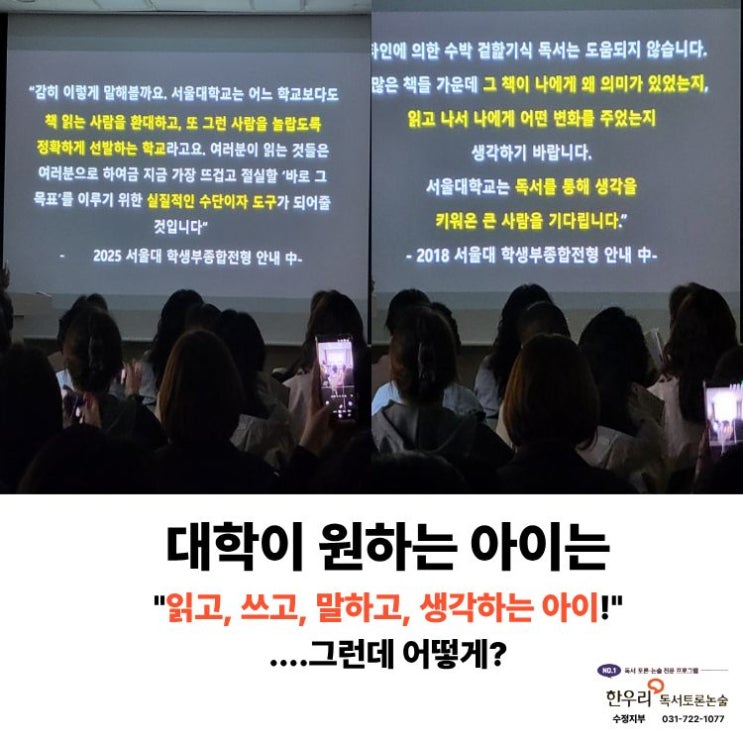 안녕하세요! 한우리 수정지부입니다. 이번 설명회도 많은 학부모님들과 학생들이 참가했습니다. 진짜 전문가가 말하는 '대학이 원하는 아이는 어떤 아이일까요?' 정답은 명쾌 했습니다. 차이는 여기에서부터 시작 된다. 태도, 탐구력, 주제화 많은 것이 변하고 있습니다. 저출산 고령화, AI 시대의 서막, 기후 위기 등등 이런 변화에 살아남으려면 스스로 탐구하고 질문해야 할 것입니다. 이제 스스로 생각하고 결정하는 힘을 길러주세요! 한우리는 그렇게 합니다. 한우리 본사 36년, 수정지부 27년 우수한 엄마들의 선택이 증명합니다. 한우리 수정지부 031-722-1077 <img src="https://blogthumb.pstatic.net/MjAyNjA0MDNfMTA3/MDAxNzc1MjAxODc3OTg0.Mqc_GsTB9OtqwCKbK6iZH06LrqzR0c8Bed66PouFOHIg.-XG-cNlqVyEKjF-5-aVxSudGT-dvdXvbiQR7Ypu8Gxog.JPEG/%BE%EE%B6%B2_%BE%C6%C0%CC.jpg?type=s3" />