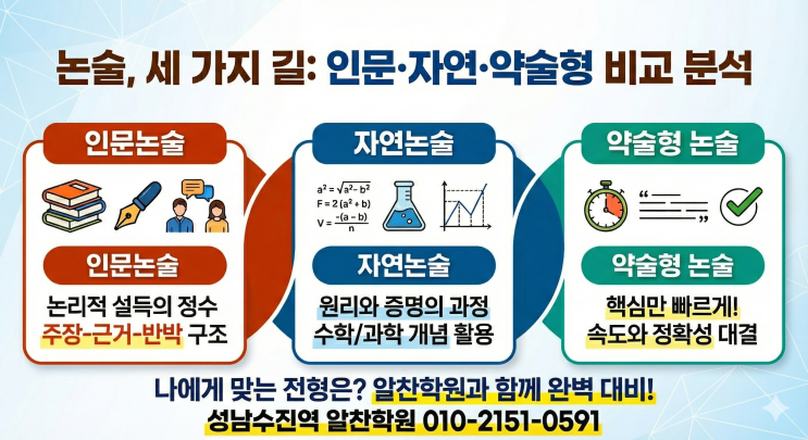 안녕하세요! 성남수진역 알찬학원 기하준 원장입니다. 수시 전형을 준비하다 보면 '논술'이라는 큰 산을 만나게 되죠? 많은 학생이 저지르는 가장 흔한 실수는 바로 “논술을 그냥 하나로 뭉뚱그려서 준비하는 것”입니다. 하지만 인문논술, 자연논술, 약술형 논술은 무엇을 평가하는지(출제 의도)부터 어떻게 써야 점수가 나오는지(답안 형태)까지 완전히 다른 시험이랍니다! 오늘 제가 아주 자세하고 친절하게, 실전에 바로 적용 가능한 꿀팁까지 싹~ 정리해 드릴게요! ✅ 1️⃣ 결론부터! 세 유형의 “본질” 한 줄 요약 인문논술 ️: 제시문을 근거로 주장-근거-반박을 조직해 설득하는 글을 쓰는 시험 자....... <img src="https://blogthumb.pstatic.net/MjAyNjAxMTFfODgg/MDAxNzY4MDk4NjU2OTAw.TTpEoS3cQzRQiQwaLjPsn-d9B1po37_4eOMooWs0vs4g.vXw7UtZ7kr46Ql9dLEB2gPDJ6JJZam3Sjla3_teZv3Qg.PNG/Gemini_Generated_Image_h4vmnlh4vmnlh4vm.png?type=s3" />