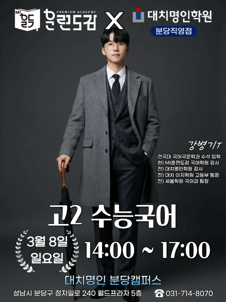 읽는 것과 분석하는 것의 차이 내신은 어느 정도 나오는데 수능 모의고사만 보면 앞이 깜깜한가요? 읽긴 읽는데 무슨 말인지 모르겠다면, 아직 수능 국어의 눈을 뜨지 못한 것입니다. 3월, 대치명인 분당캠퍼스로 통합 이전하는 훈련도감의 강병기 선생님과 함께 고2 학생들을 위한 '수능 개안(開眼)' 12주 커리큘럼을 시작합니다. [강병기T 고2 수능국어 12주 완성 포인트] 독서: 90분의 깊이, 'Deep-Dive' 분석 지문 하나를 90분간 완벽히 해체합니다. 문장, 문단, 문제 원리로 이어지는 3단계 계단식 성장을 통해 평가원의 출제 로직을 몸에 새깁니다. 문학: 감(感)을 확신으로 바꾸는 기준 더 이상 느낌으로 풀지 마세요....... <img src="https://blogthumb.pstatic.net/MjAyNjAyMTNfMTcw/MDAxNzcwOTYwNjE5MTE1.VPYZesGEhMaX_FC41UX4h0VXAQiWdVlXI-2hqHqCxYkg.EZsDSjmGLbgizG3d4nmZasUMgPjg8HkzAs8jzyF0IE8g.PNG/1440_%282%29.png?type=s3" />