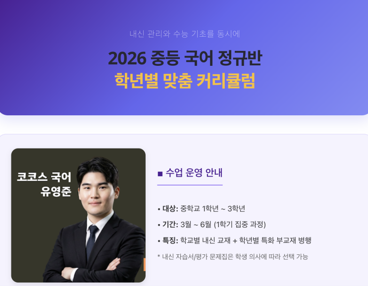이매동 중등 국어학원 정규반 학년별 맞춤 커리큘럼 안내 내신 관리와 수능 기초를 동시에 잡는 코코스학원 중등 국어 정규반의 3월~6월 상세 커리큘럼을 소개합니다. ■ 수업 운영 안내 대상: 중학교 1학년 ~ 3학년 기간: 3월 ~ 6월 (1학기 집중 과정) 특징: 학교별 내신 교재 + 학년별 필독 부교재 병행 (※ 내신 자습서 혹은 평가 문제집은 학생 의사에 따라 선택합니다.) 학년별 집중 커리큘럼 (3~6월) 중학교 1학년 (문학 기초 집중) 교재: 학교별 자습서 or 평가 문제집 + EBS 필독 중학 국어 문학 1 (2025) 3월: 학교 진도에 맞춰 내신 교재와 필독 병행 / 필독 응용하여 문학 기초 잡기 4월: 중간고사 대비 내신 비중 확....... <img src="https://blogthumb.pstatic.net/MjAyNjAyMTNfNDIg/MDAxNzcwOTQyMzM3NDEx.iPFW_rkzd6GQqaJvN_Jaugyw57OVXo3t3V_m_3Za4LUg.0qJ8M4ugWFtti9AGFWLiB8gvQY-r1bkae2bZfU_liHMg.PNG/%BD%BA%C5%A9%B8%B0%BC%A6_2026-02-13_%BF%C0%C0%FC_9.24.40.png?type=s3" />
