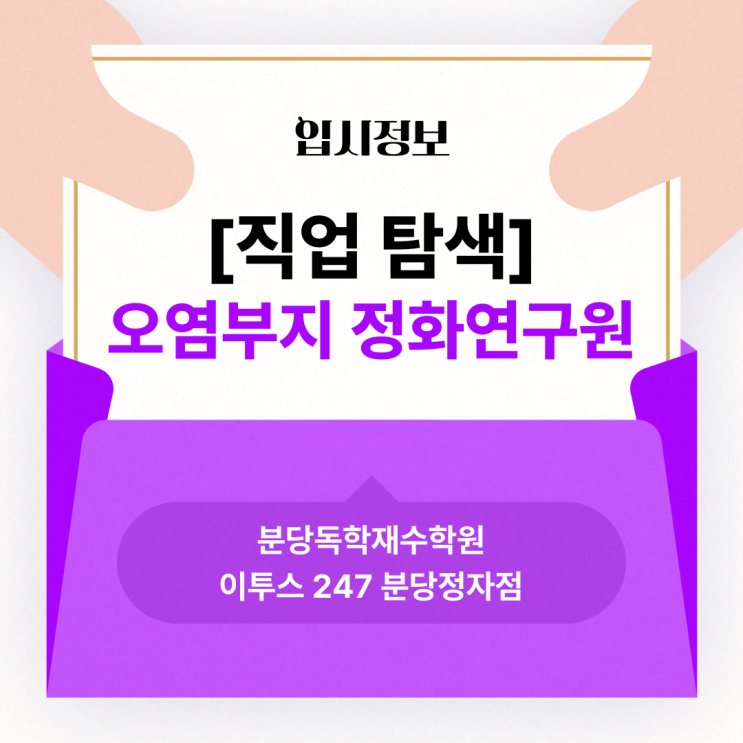 안녕~ 요즘 기후변화와 이상 기후들로 지구온난화를 몸으로 체감하고 있잖아 ㅠ 그런데 아픈 땅을 치료하는 직업이 있다고 해! 오늘은 오염부지 정화 연구원에 대해 소개해줄게 ( • ᴗ - ) ✧ (출처: https://www.edujin.co.kr/news/articleView.html?idxno=49518) 토양오염 흙은 생명체가 살아가는데 기본적인 요소인 거 다들 알쥐 흙은 농사를 비롯해 홍수예방, 수원함양, 수질정, 식생보호 등 환경적 기능을 하고 있어 :) 흙 속에 있는 지하수 역시 마찬가지야 지하수는 전세계인이 먹는 물의 거의 절반을 차지하고 있을 뿐더러 지표수의 수질에도 많은 영향을 끼쳐 이런 토양의 관리를 하는 사람을 오염부지 정화연구원이라 해! 하는 일....... <img src="https://blogthumb.pstatic.net/MjAyNjAxMjNfMTUy/MDAxNzY5MTM0ODA4MDM4.JkDoYBVyeIGlj1FTsqzyNL9mmfWyWzi7sWfIGSdoQOUg.aVCl3DEV80GwcEnjYccxcVD3OP1FvJcJsXBHnAFrXgEg.PNG/%BA%ED%B7%CE%B1%D7-%BD%E6%B3%D7%C0%CF-005_%283%29.png?type=s3" />