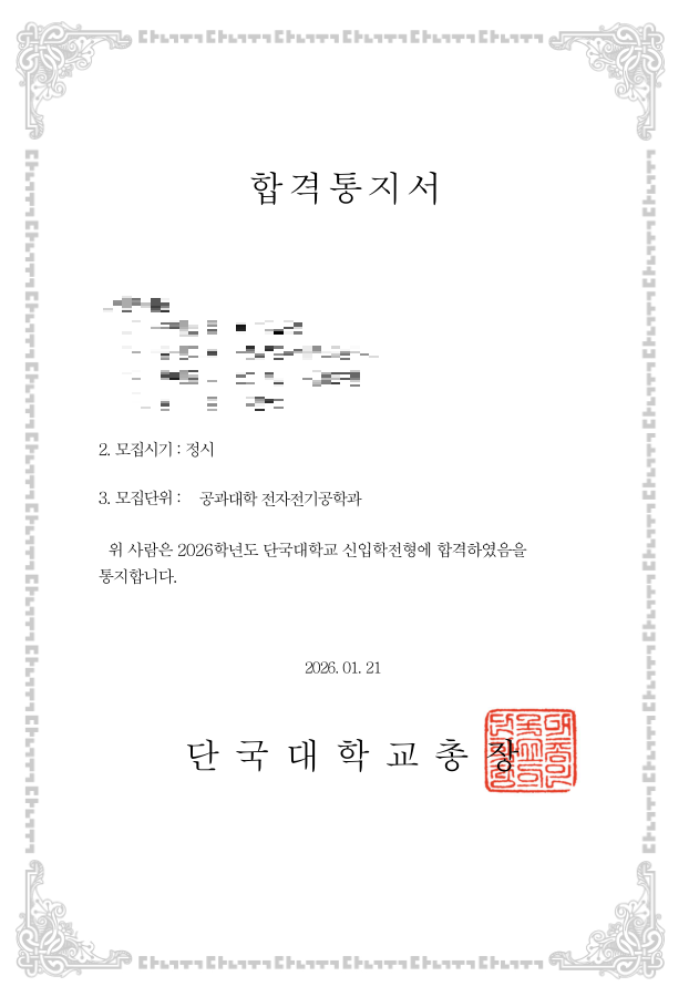 2026학년도 단국대학교 전자전기공학과 정시 최종 합격 2026학년도 단국대학교 전자전기공학과 정시모집에서 높은 경쟁 속에서도 최초 합격이라는 훌륭한 성과를 이루었습니다. **2025학년도 단국대학교 정시 전체 경쟁률(정원내)**은 약 5.79:1로 나타났습니다. 이는 전 모집단위에서 지원자가 많았음을 보여주는 수치입니다. 전공별로는 평균적인 자연계열 경쟁이 치열한 가운데, 전자전기공학과도 높은 관심과 경쟁 속에서 선발이 진행되었습니다. 2026학년도 정시 수능 반영 비율(자연계열 주요 모집단위 기준) 단국대학교 정시 수능위주 전형은 **수능 100%**로 선발하며, 자연계열 학과(전자전기공학과 포함)는 국어 20% 수학 35% 영어 15%....... <img src="https://blogthumb.pstatic.net/MjAyNjAyMDZfMjIy/MDAxNzcwMzYzMzg4MzY2.LlKYZI3b7Boi0BLX7KorgsSLMjjTYSAsyJ0d77u6ODsg.oemCX-XQ2ZT2NkPvt2-A51JDtDvGj4n28LaWQ5MANpkg.PNG/%B1%C7%C7%F6%BF%B5_%B4%DC%B1%B9%B4%EB_%C6%E8%C5%E4%BC%F6%C7%D0.png?type=s3" />