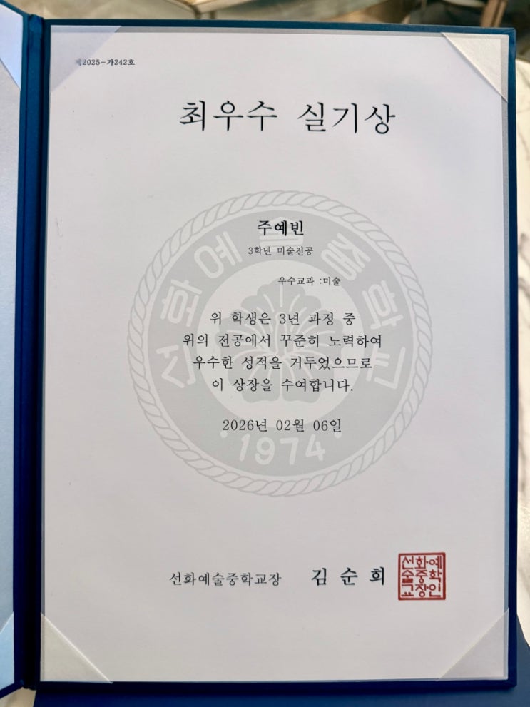 선화예중3학년 주예빈 (3년연속실기우수)