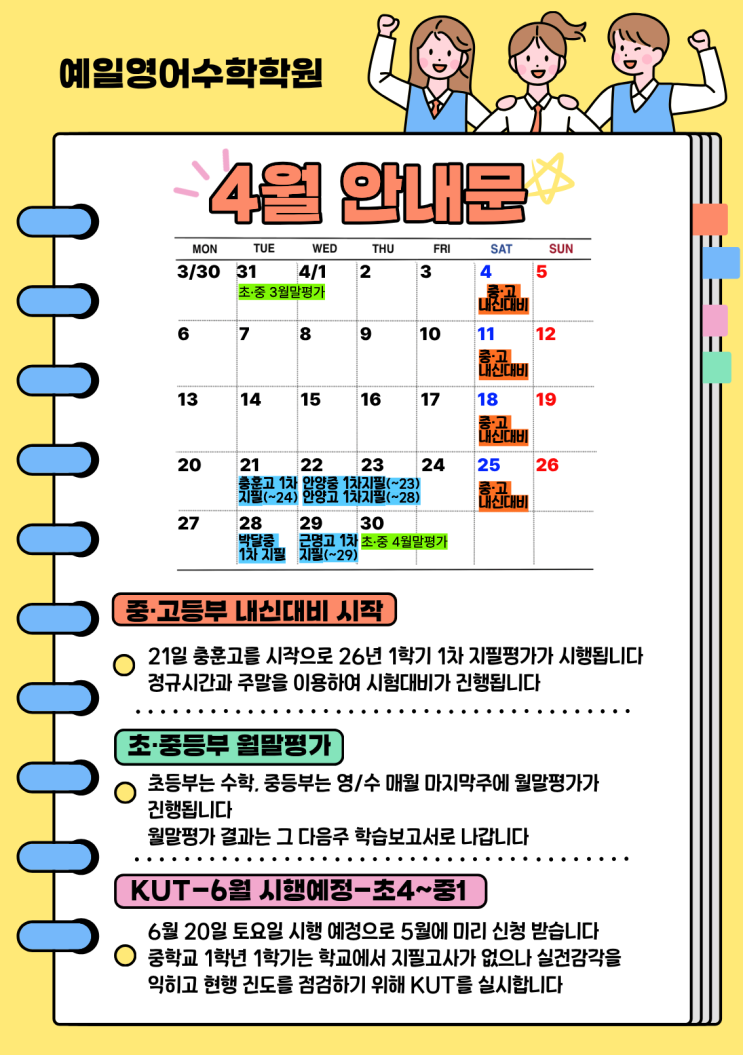 안녕하세요, 예일영어수학학원입니다. 따뜻한 봄과 함께 4월 학습 일정 안내드립니다 중·고등부 내신대비 시작 4월은 본격적인 1학기 중간고사 대비 기간입니다. ✔ 4월 21일(충훈고)을 시작으로 각 학교별 1차 지필평가가 순차적으로 진행됩니다. ✔ 학원에서는 정규 수업 + 주말 보강을 통해 시험 대비를 더욱 꼼꼼하게 진행합니다. 아이들이 첫 시험에서 좋은 결과를 낼 수 있도록 끝까지 책임지고 지도하겠습니다 초·중등부 월말평가 ✔ 초등부 : 수학 ✔ 중등부 : 영어 / 수학 ➡ 매월 마지막 주에 월말평가가 진행됩니다. 평가 결과는 다음 주 학습보고서를 통해 전달됩니다. 아이들의 학습 상태를 꾸준히 확....... <img src="https://blogthumb.pstatic.net/MjAyNjAzMjhfMjMx/MDAxNzc0Njc4Mzk3ODI2.tpIBTN3ZPNpii1esDGptaW6xhGRO5oDBn105Td-ODMQg.JqPEIHhi17xkE1WTonRp6METCy32pMeKrCmg52oOlBMg.PNG/%C1%A6%B8%F1%C0%BB_%C0%D4%B7%C2%C7%D8%C1%D6%BC%BC%BF%E4._%2811%29.png?type=s3" />