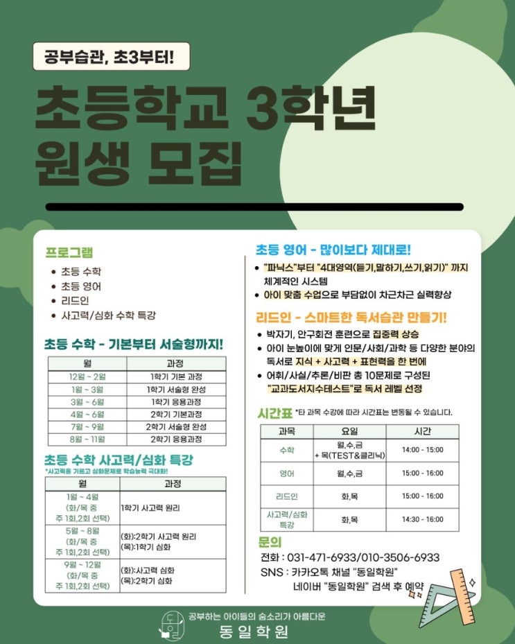 안녕하세요. 공부하는 아이들의 숨소리가 아름다운 동일학원입니다 초등학교 3학년은 ✔️ 본격적인 교과학습이 시작되고, ✔️아이들이 공부의 재미를 발견하며, ✔️고학년, 더 나아가 중고등까지의 공부습관을 형성하는 아주 중요한 시기입니다! 저희 동일학원은 아이의 올바른 학습방법을 위해 다양한 프로그램과 체계적인 커리큘럼이 준비되어 있습니다✨️ 많은 관심 부탁드리며 반짝이는 눈빛과 설레는 마음으로 꿈을 함께 키워나갈 소중한 아이들을 기다리겠습니다 <상담문의> 031-471-6933 010-3506-6933 <img src="https://blogthumb.pstatic.net/MjAyNjAxMjlfODIg/MDAxNzY5NjcyODc3MDY1.Uq8RsIpl7F1P6U7EqgOVkU1eWlj9I33TY_6GwOzh7R0g.VsQKh6vRSm28IUSST0l2--KARWlqooz9ofsXuxf2vcUg.JPEG/900%A3%DF1769665346125.jpg?type=s3" />