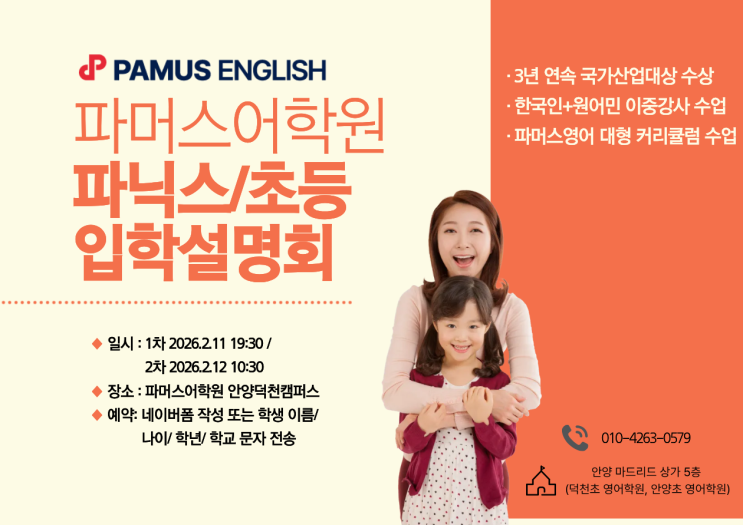 파머스어학원 2월 설명회 안내 아이의 영어 학습은 단순한 성적 향상을 넘어 자신감과 표현력을 함께 키우는 과정이 중요합니다. PAMUS 영어학원은 아이 한 명 한 명의 성향과 학습 단계를 고려한 수업으로 진행되는 영어학원입니다. 아이의 하루가 달라지는 영어 수업 PAMUS 영어학원은 스피킹과 라이팅 중심의 집중 트레이닝을 진행합니다. 스피킹 · 라이팅 집중 트레이닝 원어민 + 한국인 강사 수업 안전한 차량 운행 시스템 운영 PAMUS 영어학원은 안양초 안양역푸르지오, 안양씨엘포레, 안양어반포레 덕천초 안양메가트리아 3월부터 차량 운행 예정입니다. 2월 설명회 일정 안내 PAMUS 영어학원에서는 학부모님께 파머스 커리큘럼, 영어 입....... <img src="https://blogthumb.pstatic.net/MjAyNjAyMDJfMTU5/MDAxNzcwMDExOTc5MTE3.iI3vhRux7tD_YbwFT4pejSdqM8q2rqzoxL8u_QIK67Yg.y1QzxUE2rriKwq1653xtab8-2uJx9KTGVdyVSBWljgYg.PNG/%C1%A6%B8%F1%C0%BB_%C0%D4%B7%C2%C7%D8%C1%D6%BC%BC%BF%E4._%2812%29.png?type=s3" />