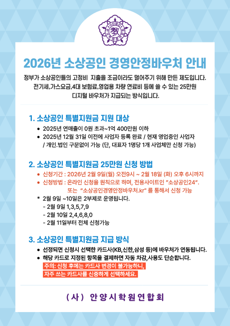 소상공인 대표님들 힘내세요. 올 겨울 유난히 추워서 난방비 폭탄 맞지는 않으셨는지요. 여름엔 에어컨 전기세로 겨울엔 아이들 추우면 안되니 난방 전기세로. 들어오는 수입은 한정적인지 나가는돈은 늘기만 하지 줄지는 않죠... 네. 다들 이 힘든시기를 잘 견디고 계시죠. 이번에 소상공인들을 위한 경영안전 바우처 신청 정보를 보고 우리 안양시학원연합회 공지 글도 올리고 음악분과 원장님들에게도 공지해드리고 제 주변 소상공인 대표님들도 보시고 신청하시라고 글을 올려봅니다. 힘내세요. 홧팅!!! <img src="https://blogthumb.pstatic.net/MjAyNjAyMDJfMjI4/MDAxNzY5OTY0NTE2MzA3.-v_mFhfcdxgz1WYDer94F3A_x1UesEgCr6_9xz4gj34g.ZEJAmK6zYu2w74JBxZ1gkMwaEmQ-nf-kWF9T8haAG6Yg.PNG/1769950863197.png?type=s3" />