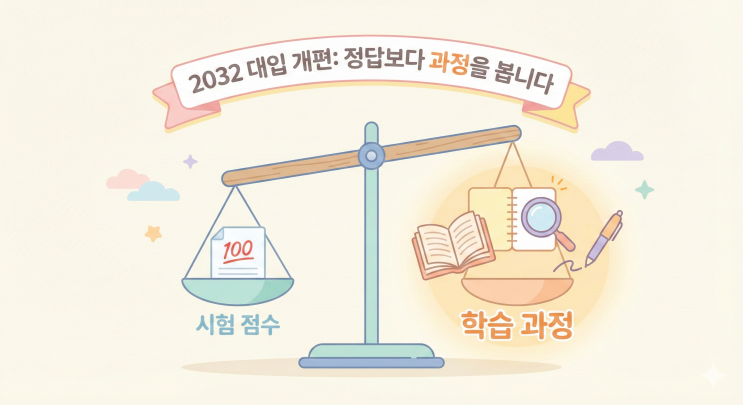 최근 교육계의 가장 뜨거운 화두는 단연 2032학년도 대입 개편이에요. 아직 멀게만 느껴지시나요? 하지만 현재 초등 고학년 자녀를 둔 학부모님들이라면 지금 당장 주목해야 할 '룰의 변화'가 시작되었습니다. 과연 무엇이 달라지고, 우리 아이는 초등 시절을 어떻게 보내야 할까요? 대교 눈높이 전략가와 함께 핵심만 짚어보아요! 1. '결과'가 아닌 '과정'을 보는 평가의 시대 2032 대입 개편의 핵심은 한마디로 ‘점수 중심’에서 ‘과정 중심’으로의 대전환이에요. 기존에는 단편적인 지필고사 성적으로 아이들을 한 줄로 세웠다면, 이제는 아이가 어떤 과정을 거쳐 학습했는지, 그 사고의 깊이를 측정하는 데....... <img src="https://blogthumb.pstatic.net/MjAyNjAyMDNfMTA2/MDAxNzcwMDgzMTA4MjIy.6GsSNEhj1W6xmrE-SEOcaJ8OAeN1HYoq0pvYHKh50igg.DK-i3fWjmthBLCpOWNS2rifALimnMBo6PqGYZZs9XgQg.PNG/Gemini_Generated_Image_sq5jbdsq5jbdsq5j.png?type=s3" />