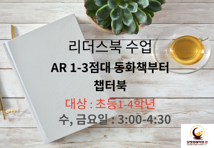 영어 처음 시작하는 반부터 리더스북 또는 챕터북수업을 받고자 하는 수업이 열릴 준비가 되었습니다. 요일과 시간을 확인해서 연락을 주시면 됩니다. 26년도 원서를 읽고 사고력확장과 워크북활동으로 정확성, 롸이팅 실력을 키우는 것을 목표로 한다면 전화주시기 바랍니다. 031-342-1080 <img src="https://blogthumb.pstatic.net/MjAyNTEyMDlfMTA0/MDAxNzY1MjYyMTQ5ODYx.s3b5158jRxmYBwRvLy0Thh1_nIdVg8Is5WY8LEkzcvMg.CTmPubqETneoQtFM4I7WxsitRbFciv1YOiORT3aU2Pog.PNG/%C1%A6%B8%F1_%BE%F8%C0%BD-1.png?type=s3" />