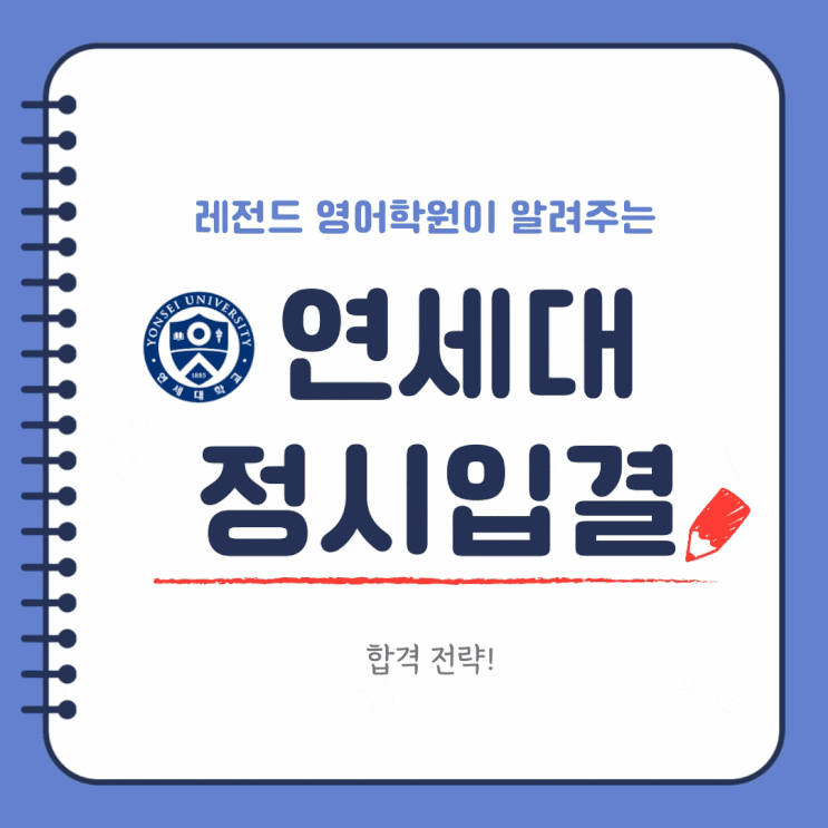 연세대학교 미래캠퍼스 정시입결 및 합격 전략 안녕하세요. 레전드 영어학원입니다. “국어랑 수학만 잘 보면 되지 않나요?” 이 질문, 아직도 많이 듣습니다. 하지만 2026학년도 연세대 미래캠퍼스 정시 전형을 보면, 영어 등급 하나로 합불이 갈리는 구조라는 걸 확인할 수 있습니다. 우리 아이가 준비하고 있는 모집단위가 어디냐에 따라, 영어는 ‘당락을 좌우하는 핵심’입니다. 지금부터 연세대학교 미래캠퍼스 정시 입결을 분석하고 레전드 영어학원의 영어 1등급 전략을 알려드리겠습니다. 연세대학교 미래캠퍼스 전형일정 일반·자연계열 (간호학과, AI반도체학부 등) - 영어 등급은 100점 만점으로 반영 - 2등급은 95점, 3등급은 90점으....... <img src="https://blogthumb.pstatic.net/MjAyNTEyMDlfODIg/MDAxNzY1Mjc5MTE5NzA1.Ehal7wPkg1d9gQq9QZLBGcjahnPRBI4SK4AYvgdoeDsg.CJLRBwVtcStw0jy5j8jWBFrE-KM8znnagg5NO4XyWLgg.GIF/%C1%A6%B8%F1%C0%BB-%C0%D4%B7%C2%C7%D8%C1%D6%BC%BC%BF%E4__%2898%29.gif?type=s3" />