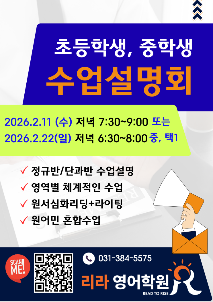 안녕하세요. 리라 영어학원입니다. 새학기를 맞아, 학부모님들과의 만남을 통해 "리라의 교육 철학과 수업과정"등을 설명하는 자리를 마련하였습니다. 아래 QR code 또는 홈페이지 방문하셔서 접수해주세요. https://readtorise.co.kr/openhouse 감사합니다. #평촌영어학원 #평촌초중등영어학원 #원서중심영어학원 #평촌영어원서 #영어라이브러리 #원서라이팅 #영어독서 #원서중심 <img src="https://blogthumb.pstatic.net/MjAyNjAxMzBfMTE5/MDAxNzY5NzM1NjU3NzEy.csraiWCp3PtbsILweSdee-cR-kTcguUY2xu4OjYd0lwg.aQRrYSkhXLpOvNIGopomajHob4HHkHdygu-ZPX4gxCkg.PNG/%BC%B3%B8%ED%C8%B8.png?type=s3" />