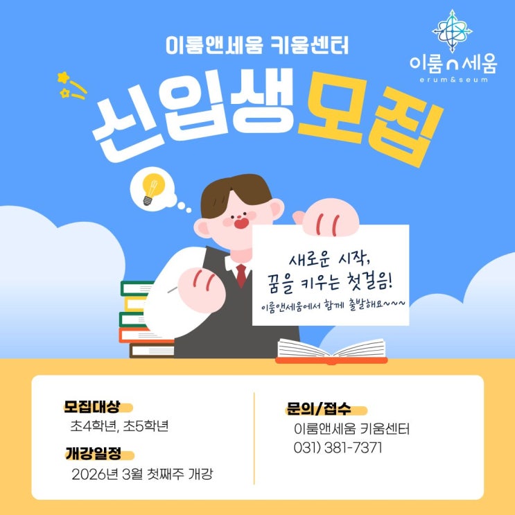 초4학년 ★ 초4학년 대상 신규 모집 ★ ▶ 모집대상: 초4-1 과정을 이수한 초4학년 ▶ 개 강 일: 2026년 3월 2일(월요일) ▶ 수업요일: 월금 4:00~6:00 (누적TEST 월금 6:00~7:00) ▶ 입학절차: 입학테스트 진행후 반 배정 초5학년 ★ 초5학년 대상 신규 모집 ★ ▶ 모집대상: 초5학년(자세한 과정은 상담시 안내) ▶ 개 강 일: 2026년 3월 2일(월요일) ▶ 수업요일: 월수금 4:00~6:00 (누적TEST 월수금 6:00~7:00) ▶ 입학절차: 입학테스트 진행후 반 배정 2월 상시 입학테스트 진행합니다. 학원으로 문의주시면 상세한 답변 드리겠습니다. ☎상담문의 031)381-7371 #이룸과세움, #이룸앤세움, #이룸n세움, #이룸앤세움_키움센터, #이룸앤세움_키....... <img src="https://blogthumb.pstatic.net/MjAyNjAyMDNfMjEz/MDAxNzcwMDk1ODYwODgx.8kzqscPeuEXV_lPdHNR2tnTk2Sex42fODxpvO73CFsog.SDdJcC3xqAkLNInAxmZLoWfDwI82aurCfxOlGYxPe90g.JPEG/%C1%A6%B8%F1%C0%BB_%C0%D4%B7%C2%C7%D8%C1%D6%BC%BC%BF%E4_%282%29.jpg?type=s3" />