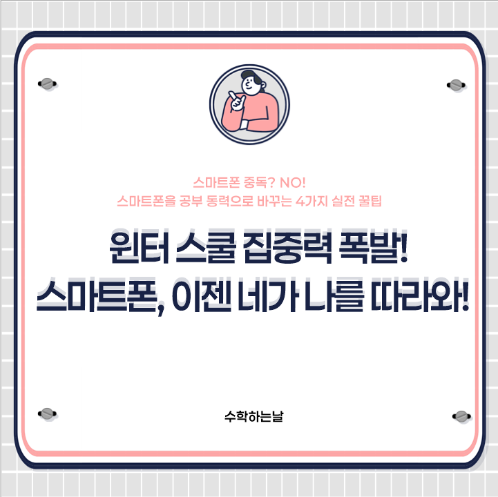 안녕하세요, 수날입니다! 윈터 스쿨, 방학 특강을 시작하면 다짐은 늘 비슷합니다. “이번엔 진짜 집중해서 해야지!” 그런데 책상에 앉은 지 10분도 안 돼서 스마트폰을 들고 있는 나를 발견하게 되죠. 스마트폰은 나쁜 도구가 아닙니다. 문제는 우리가 주도권을 쥐고 있지 않다는 것입니다. 오늘은 스마트폰을 무작정 끊는 대신, 공부의 동력으로 바꾸는 4단계 방법을 정리해보았습니다. 스마트폰을 긍정적인 방향으로 활용하려면 ✔ 집중이 깨지는 구조를 이해하고, ✔ 행동을 바꾸는 장치를 만들고, ✔ 스스로를 관리하는 힘을 길러야 합니다. 다음과 같은 4단계를 실천하면 윈터 스쿨 기간 동안 집중력의 질 자체가 달라지는 경험을 하....... <img src="https://blogthumb.pstatic.net/MjAyNTEyMjJfMjQx/MDAxNzY2NDA2OTM5MDU0.ErlLDC7uh7HmKlr9y0YHWt1iL3bhXUUj1JmPVv1zzw0g.E5ScgttU94kckH9muaOR3IO5lhDKVtAO1QdMjzTSF5wg.PNG/image.png?type=s3" />