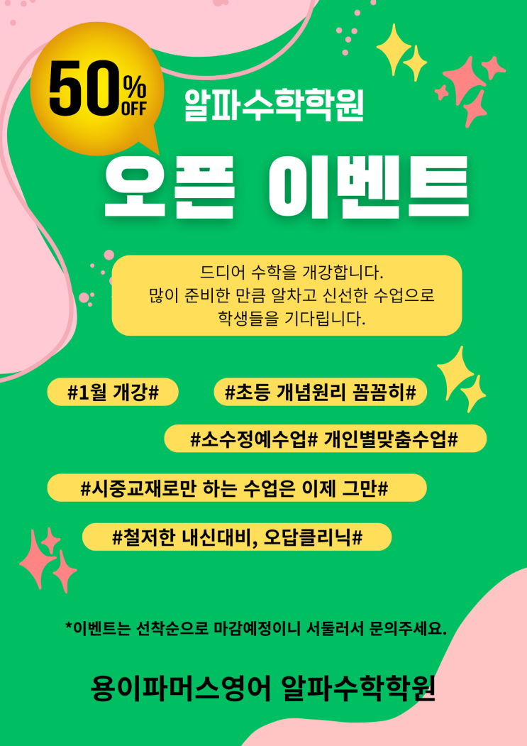 안녕하세요^^ 원장 인사드립니당^^ 저희가 수학도 시작하게 되었습니다. 이제 용이파머스영어알파수학학원으로 인사드리게 되었습니다. 영어는 믿고 맡겨주셔서 중학생들도 좋은 결과를 맺고 있습니다. 이번에 시작하는 수학 안내 조금 드리겠습니다. 수학은 단원별로 딱 끊어지는 과목이다보니 영어와는 다르게 눈에 보이는 결과물이 있습니다. 진도만 빼고 무리하게 하는 선행은 아무의미 없다는 거 다들 알고 계시죠??? 고등수학까지 하셨던 경험이 많으신 선생님을 모셨습니다. 꼼꼼하게 개념배우고 연습문제도 풀고 오답문제도 쌍둥이문제로 바로바로 풀고 아이수준과 속도에 맞춰서 맞춤수업을 진행할 예정입니다. 오답수정하고 바로바로 온....... <img src="https://blogthumb.pstatic.net/MjAyNjAxMTRfMjM0/MDAxNzY4Mzc5NzI1ODc2.lpyPXSKEf0eNhG6x0hV7sj5uu7PlieLjdabrqjwf_4Ag.AXrEUttLrkYx5ZnZWZrmeG8GQ8nEyzSAGU8ya10wpHEg.PNG/%BE%CB%C6%C4%BC%F6%C7%D0%C7%D0%BF%F8%BF%F8.png?type=s3" />